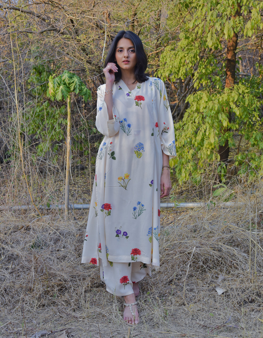 Introducing our cream floral printed kurta set. This relaxed-fit piece showcases v neck collar detail....