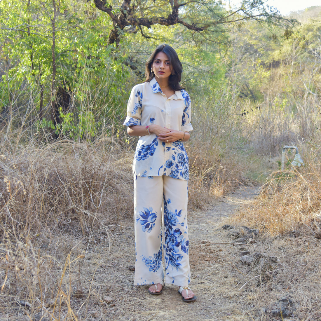 Step into effortless style with this chic Ivory & Blue Floral Co-ord Set. The shirt...
