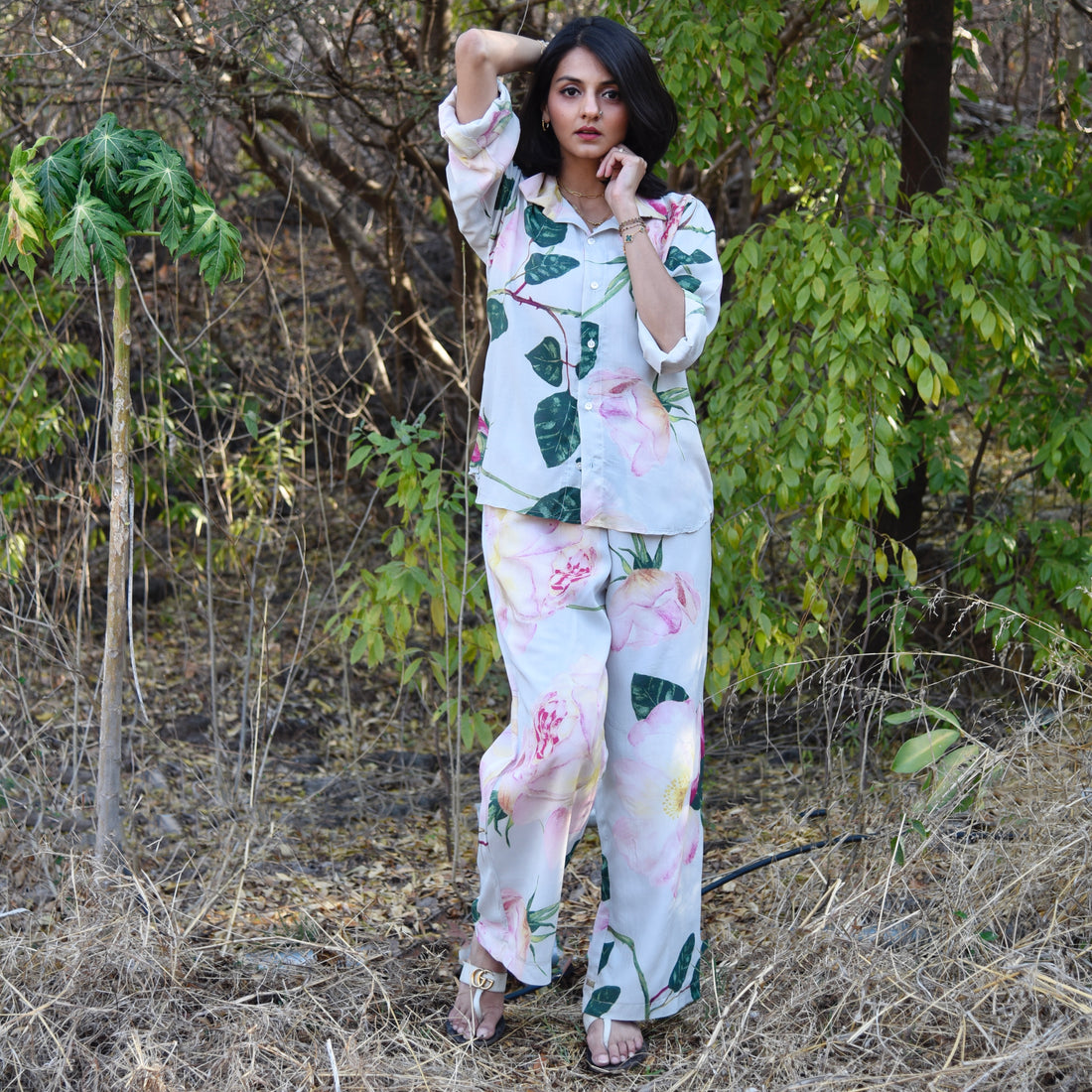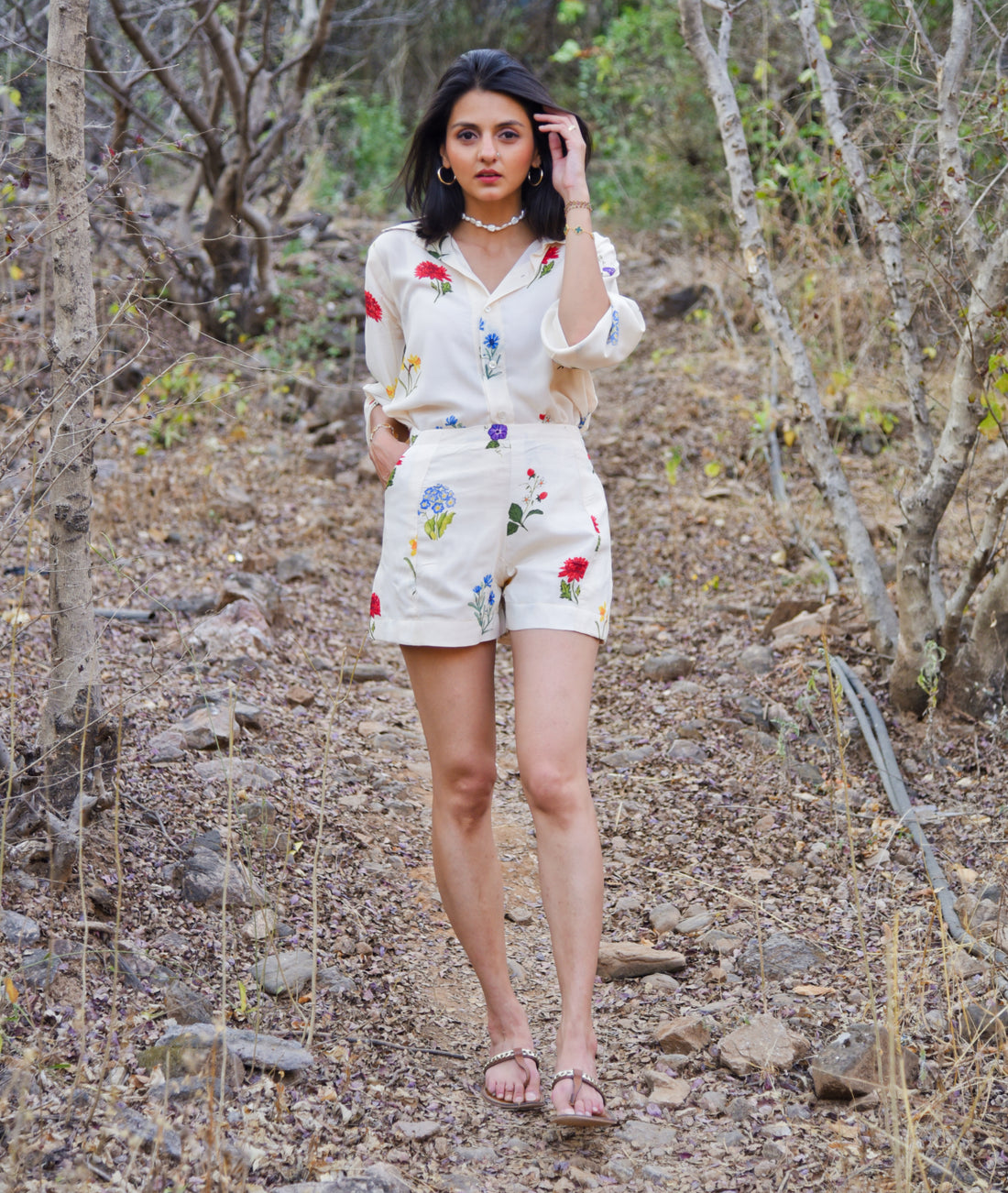 Introducing our delightful cream floral printed co-ord set. The straight fitted shirt features puffed sleeves...