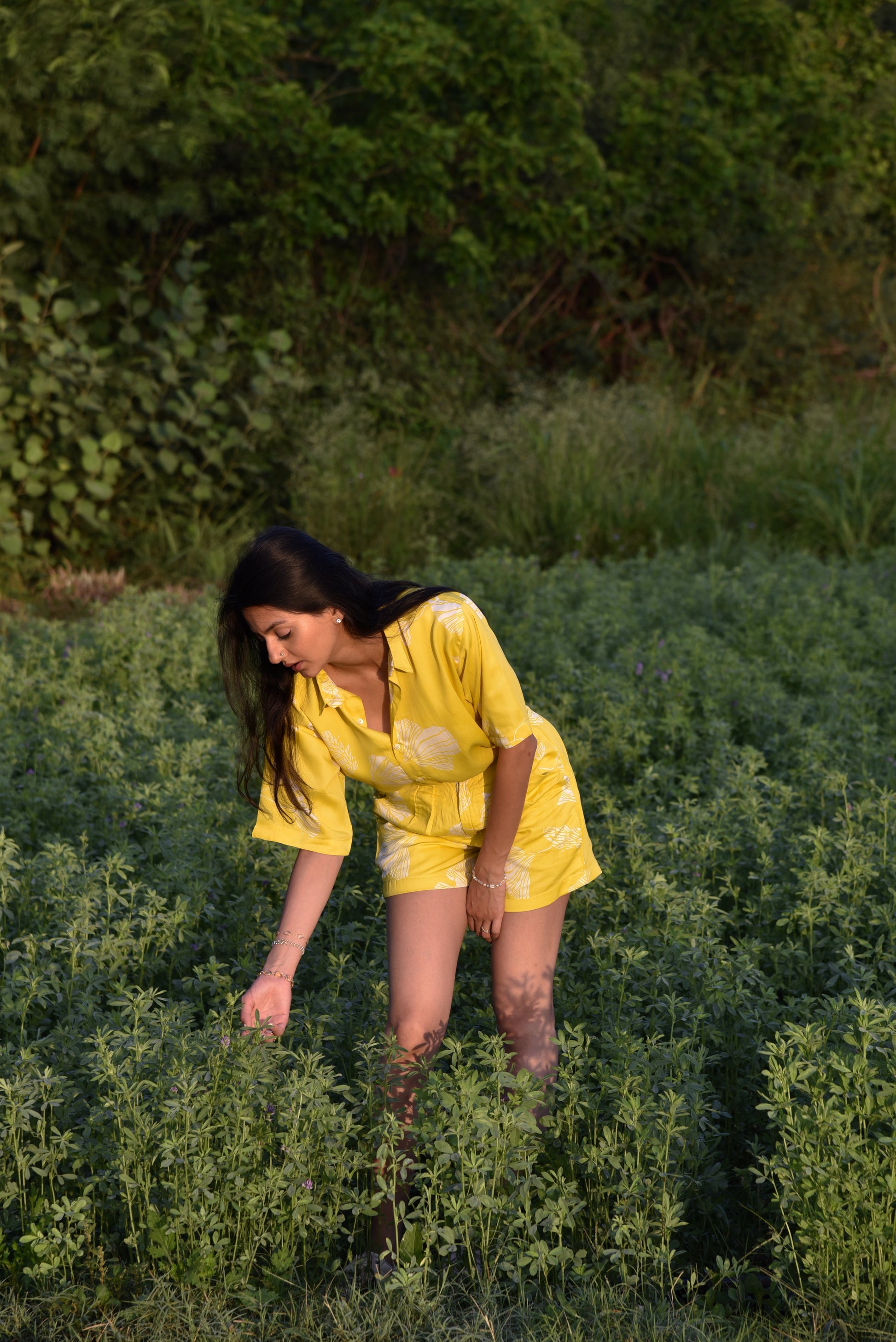 Introducing the Akino Set, an exquisite yellow floral print short set designed to elevate your style. This ensemble showcases high-waisted shorts and a half-sleeve shirt embellished with elegant white pearl buttons. Crafted from lustrous modal satin fabric, the Akino Set exudes a beautiful shine, adding to the overall charm of the outfit. Ideal for those seeking stylish and comfortable summer dresses for women, the Akino Set offers a perfect blend of a casual cotton dress and a fashionable co-ord set, making it an essential addition to your wardrobe.