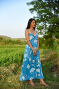 Introducing the Alana Dress, a captivating blue printed dress designed to make a lasting impression. This elegant dress features adjustable tie-up details on the chest, allowing you to customize the fit to your preference. The A-line silhouette gracefully flows from the chest to the bottom, enhancing the elegance and femininity of the design. Perfect for any occasion, this dress is a must-have for your summer wardrobe. Perfect for any occasion, this dress features a beautiful floral print, making it a standout piece in your collection of floral print long dresses. The Alana Dress showcases a stunning floral print that brings a touch of nature's beauty to your wardrobe, ideal for those who love floral print long dresses.