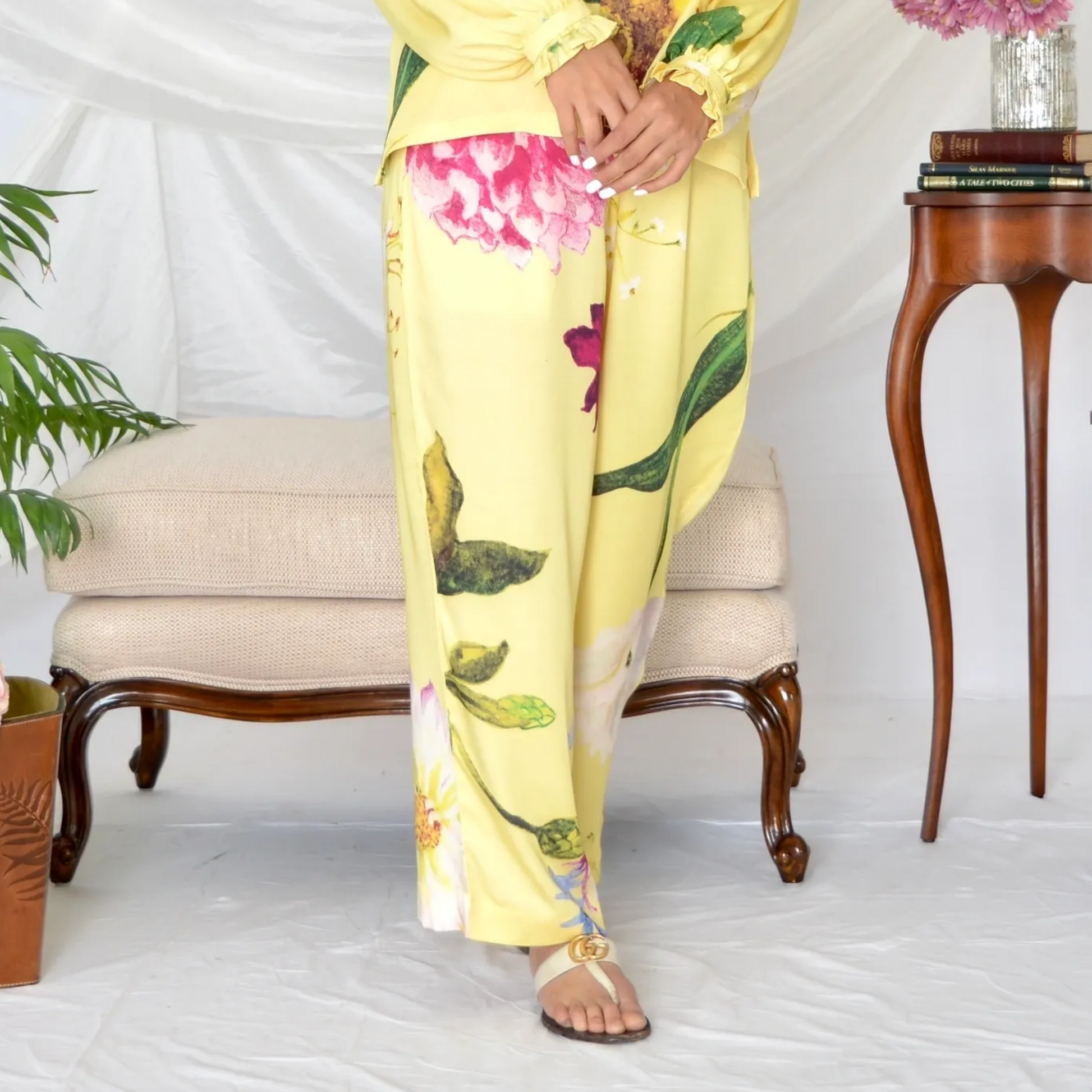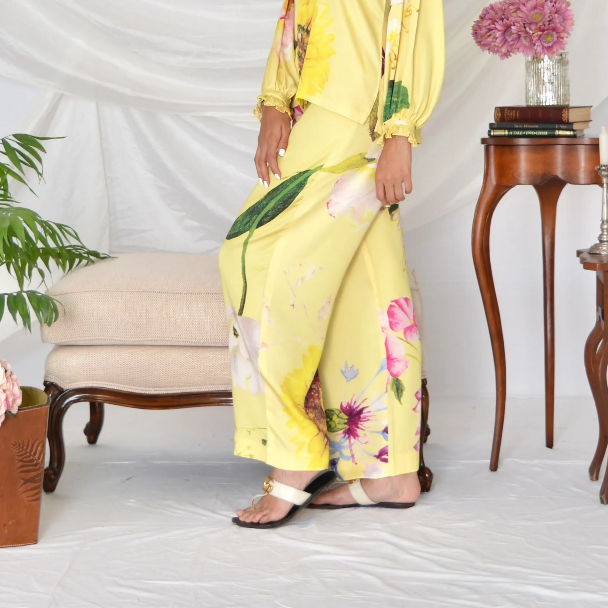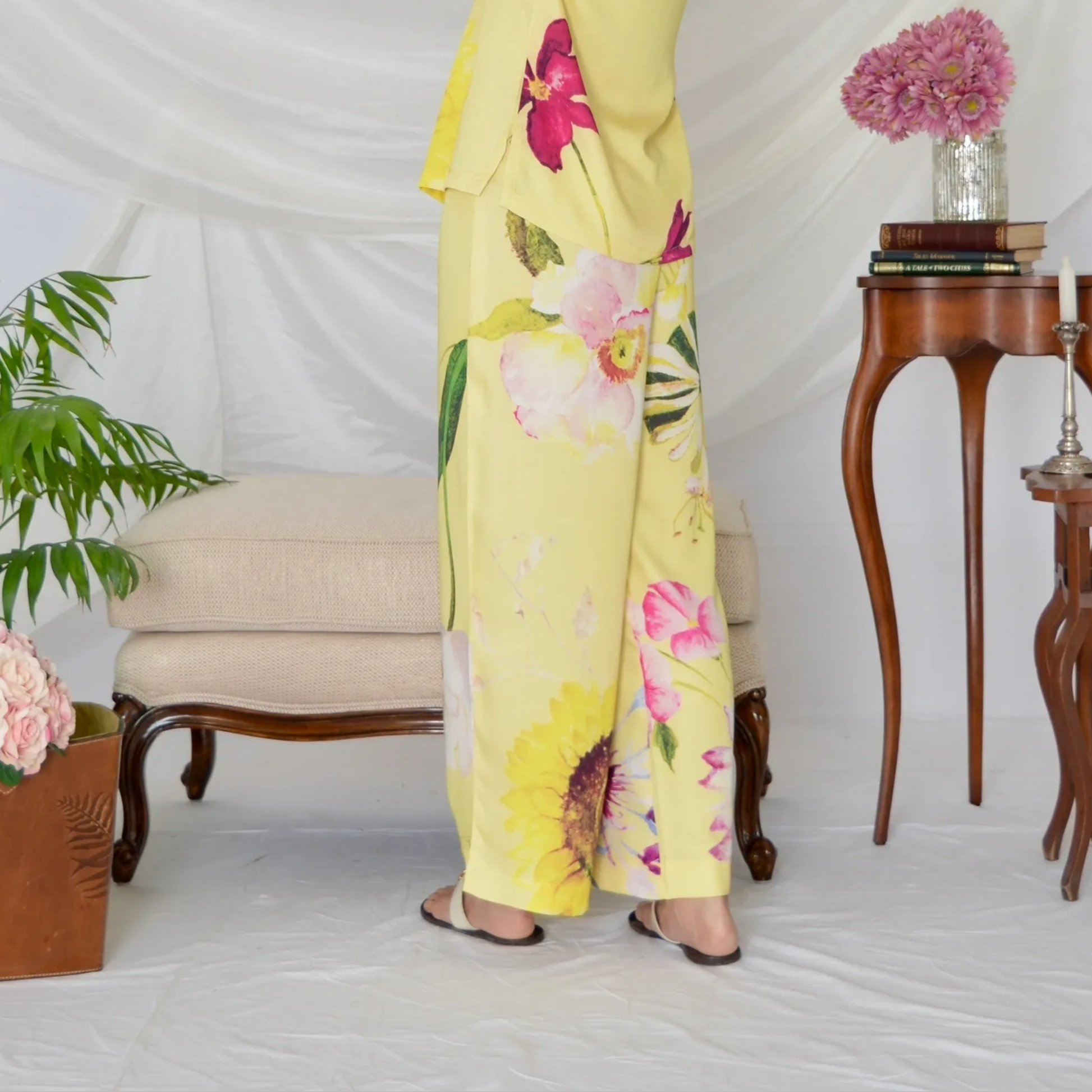 Presenting our Billie pants in Yellow, adorned with enchanting flower motifs. The pants are high-waisted and wide legged that create a timeless silhouette, flattering every figure. The lightweight, breathable fabric and floral design make it a standout choice among summer dresses for women, ensuring you stay chic and cool in the warmer months.