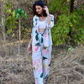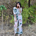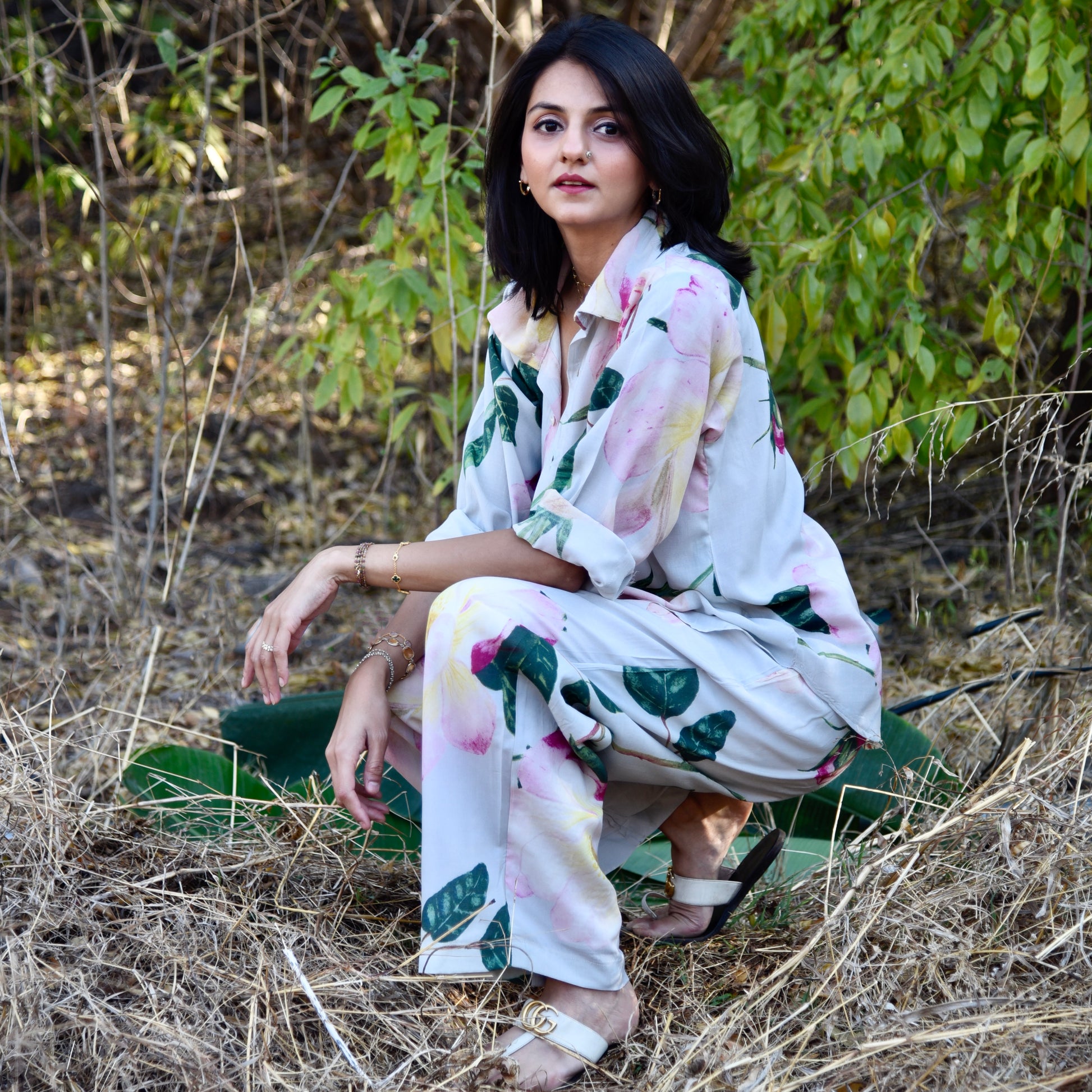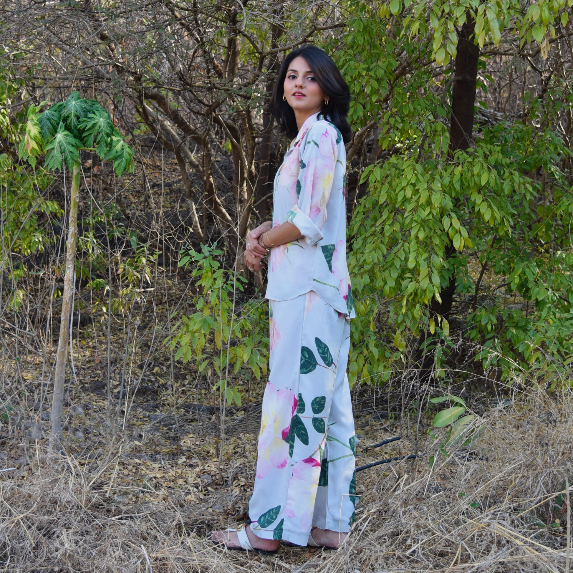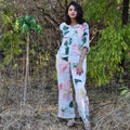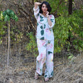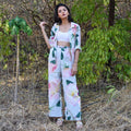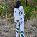 Discover the Bourbon Set in blue, a stunning co-ord set adorned with rose motifs. The shirt is a full sleeves long with rounded edges with delicate mother of pearl buttons. Paired with high-waisted, straight-leg pants, this set offers a timeless silhouette that exudes sophistication. Embrace the beauty of nature and radiate effortless style with this enchanting co-ord set, perfect for any occasion where you want to make a statement with sophistication.