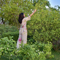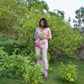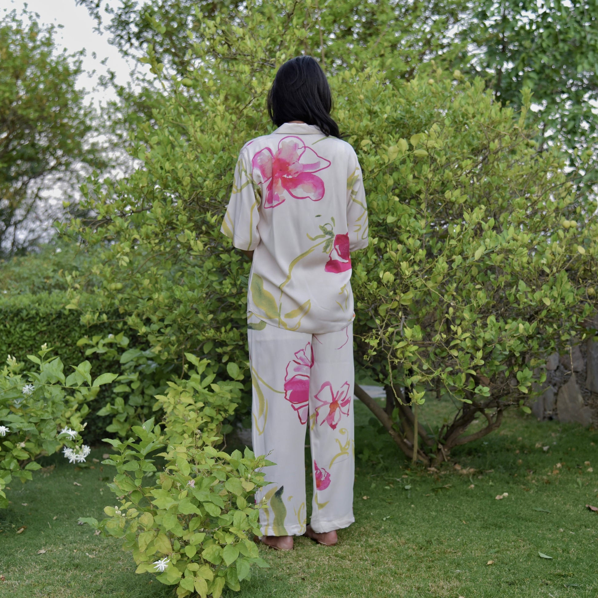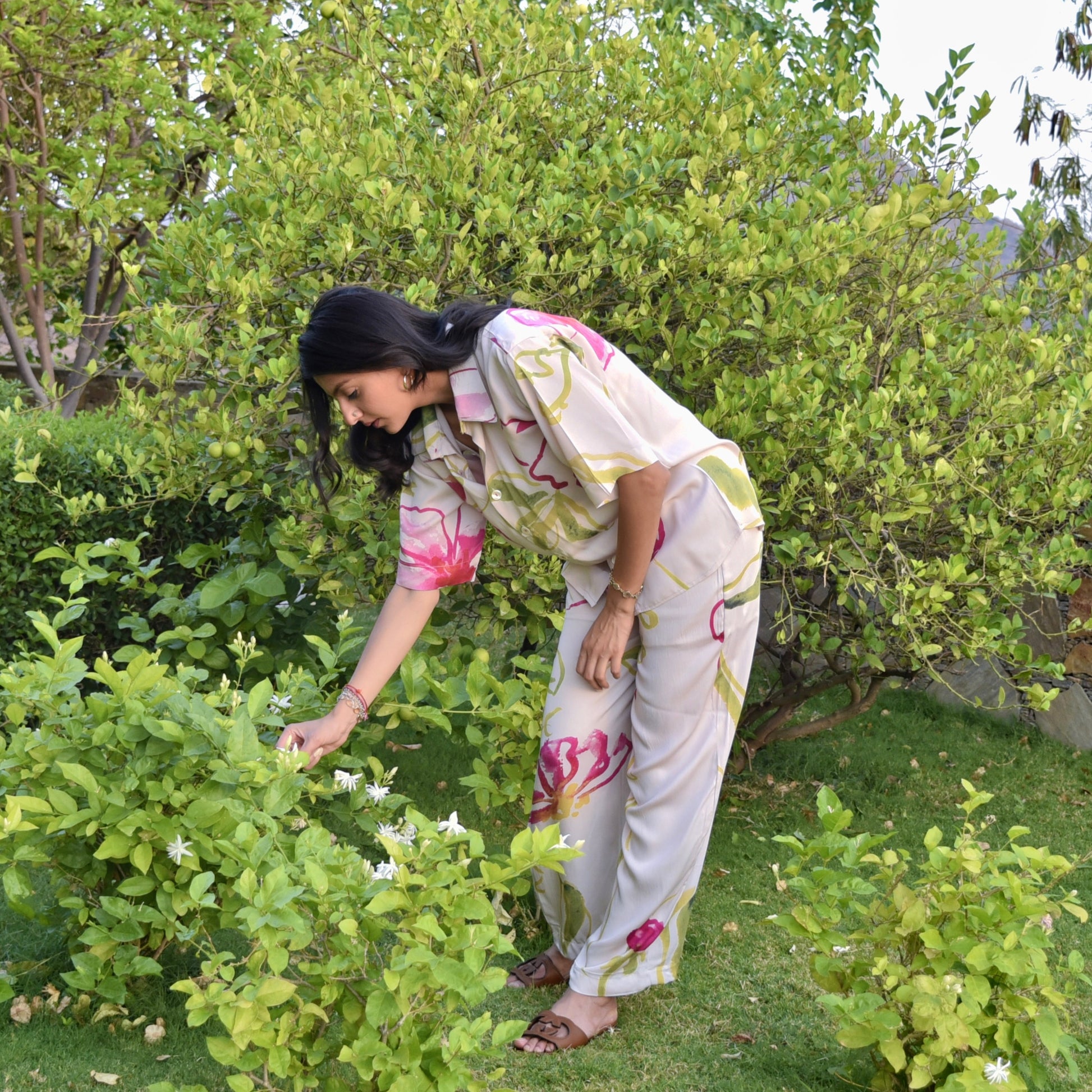 Presenting our cream floral printed co-ord set. The shirt boasts a trendy half sleeves boxy style, adding a modern touch to your ensemble. Delicate mother of pearl buttons adorned with small pink thread details elevate the outfit with a subtle hint of charm. Paired with high-waisted, straight-leg pants, this set offers a timeless silhouette that exudes sophistication. Enjoy the perfect balance of comfort and fashion with this thoughtfully designed co-ord set. The breathable fabric and relaxed fit make it ideal for all-day wear. Oodeypore is the perfect choice for any occasion, offering a blend of style, comfort, and elegance. Whether you're looking for a summer co-ord set, printed co-ord set, or a floral co-ord set, this ensemble has it all.