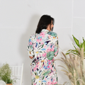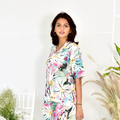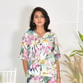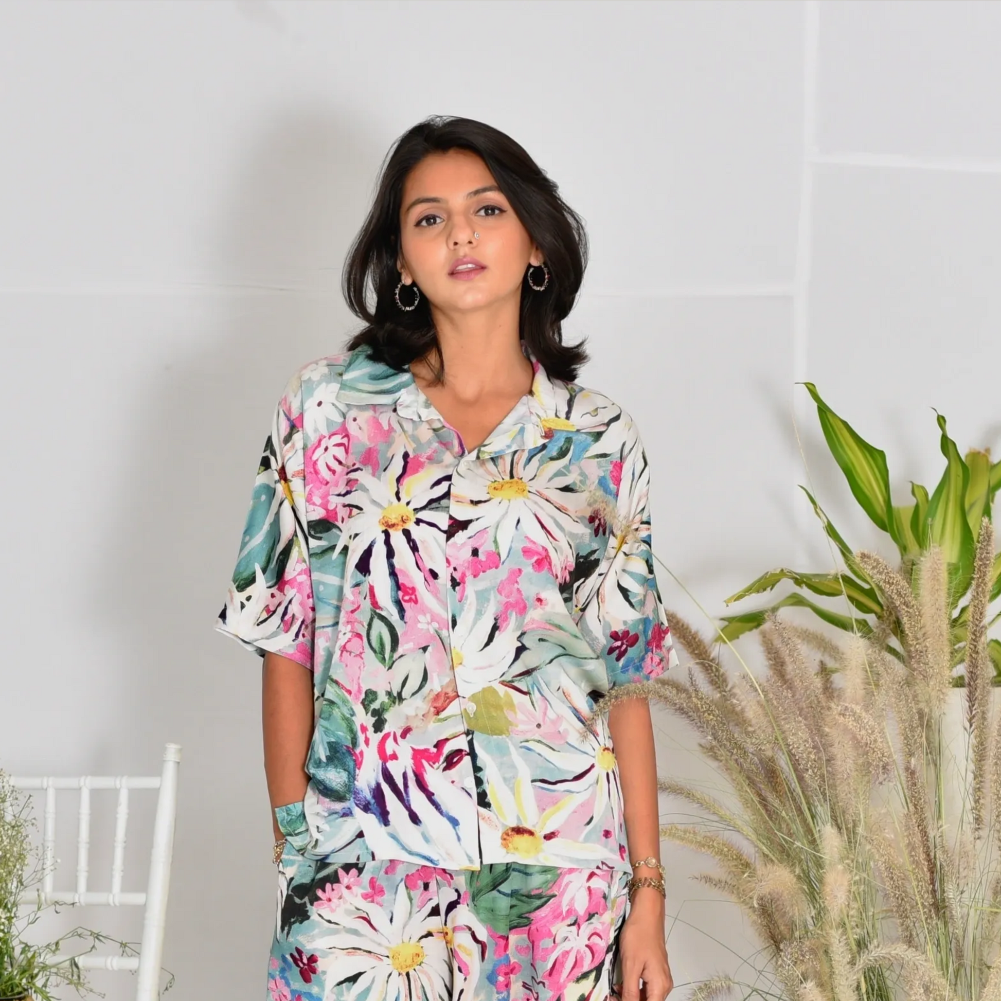Presenting our cream floral printed shirt. The shirt boasts a trendy half sleeves boxy style, adding a modern touch to your ensemble. Delicate mother of pearl buttons adorned with small pink thread details elevate the outfit with a subtle hint of charm. The breathable fabric and relaxed fit make it ideal for all-day wear.
