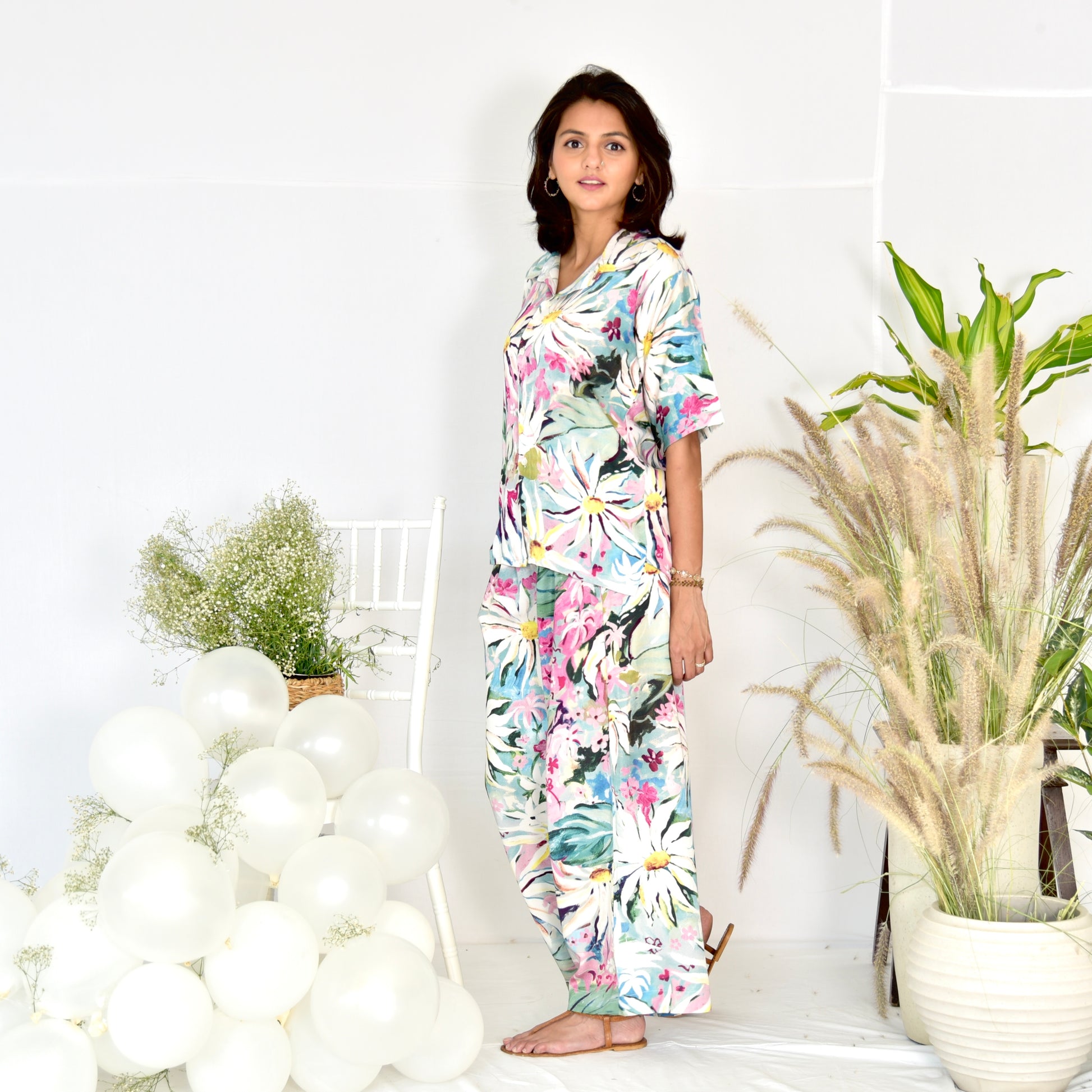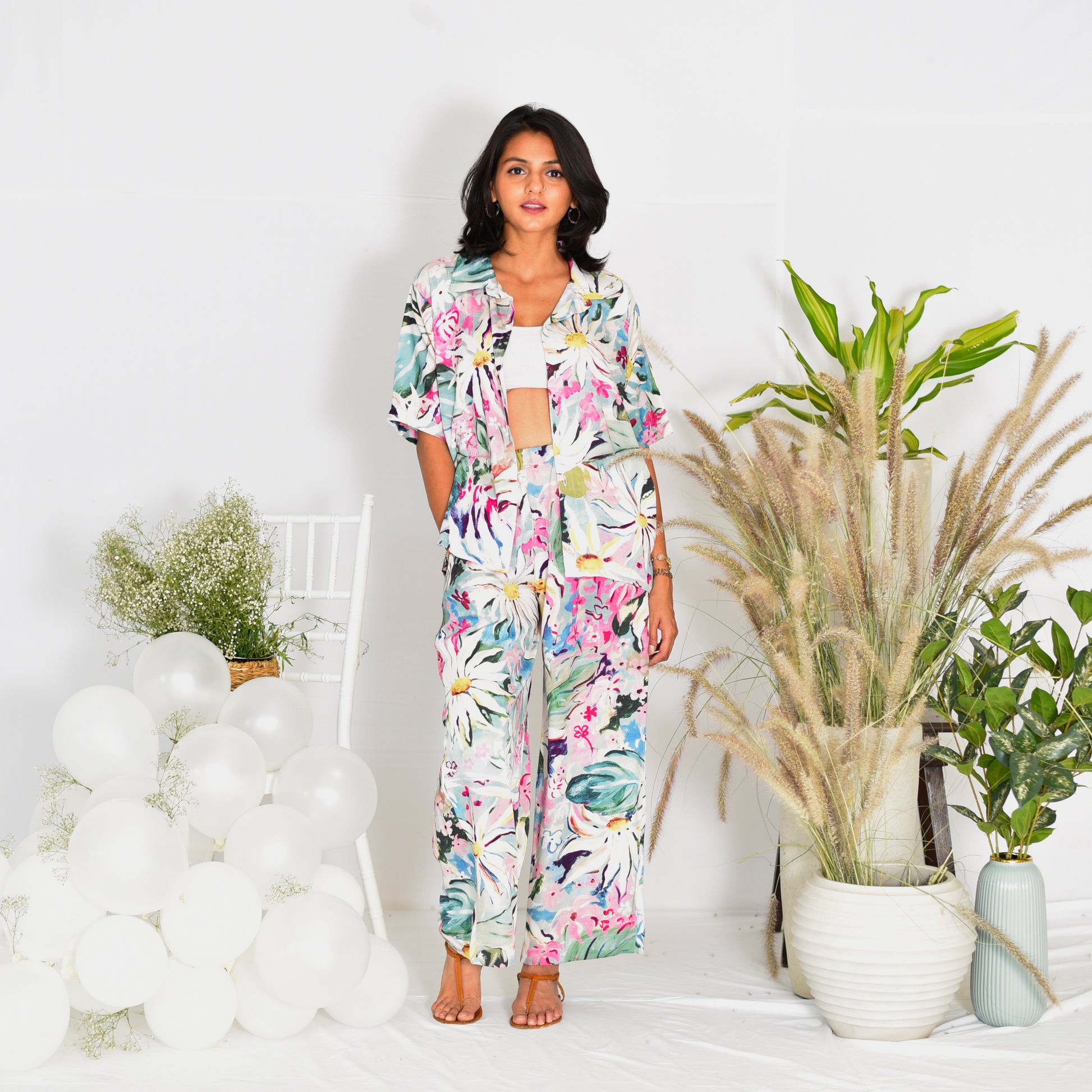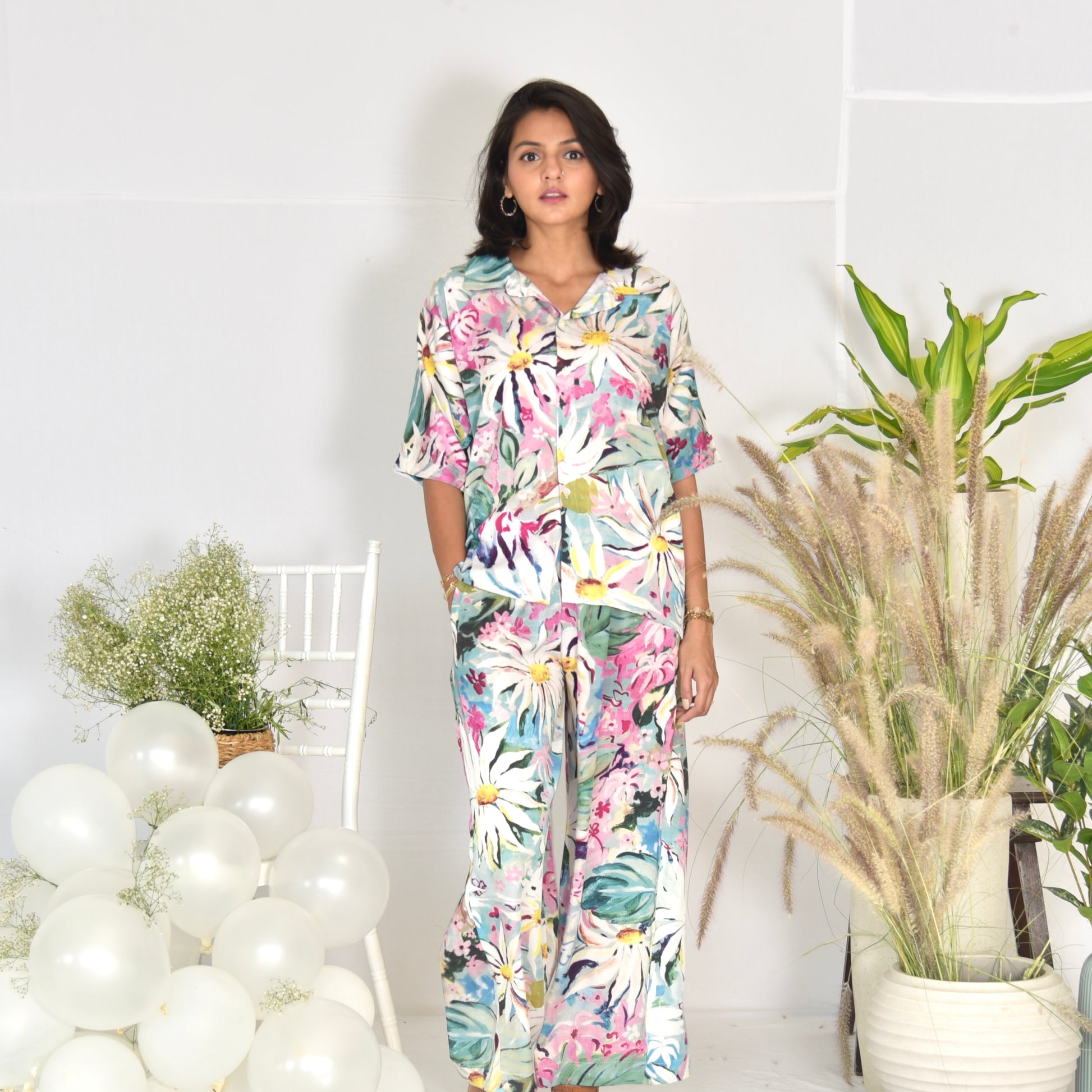 Presenting our abstract co-ord set. The shirt boasts a trendy half sleeves boxy style, adding a modern touch to your ensemble. Delicate mother of pearl buttons elevate the outfit with a subtle hint of charm. Paired with elastic high-waisted, straight-leg pants, this set offers a timeless silhouette that exudes sophistication. Enjoy the perfect balance of comfort and fashion with this thoughtfully designed co-ord set. The breathable fabric and relaxed fit make it ideal for all-day wear. Oodeypore is the perfect choice for any occasion, offering a blend of style, comfort, and elegance. Whether you're looking for a summer co-ord set, printed co-ord set, or a floral co-ord set, this ensemble has it all.