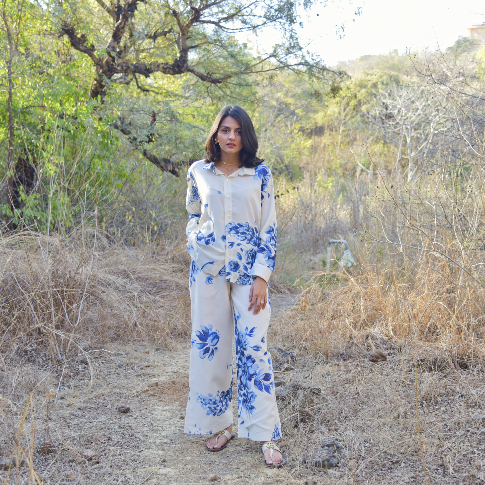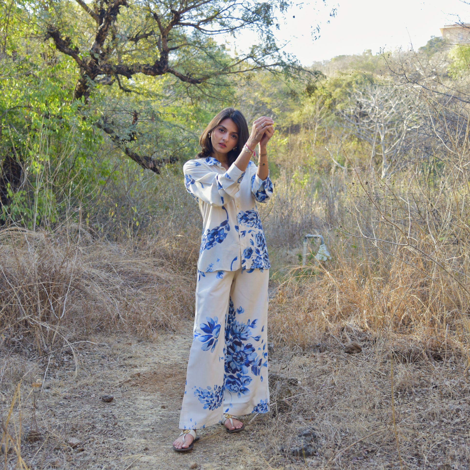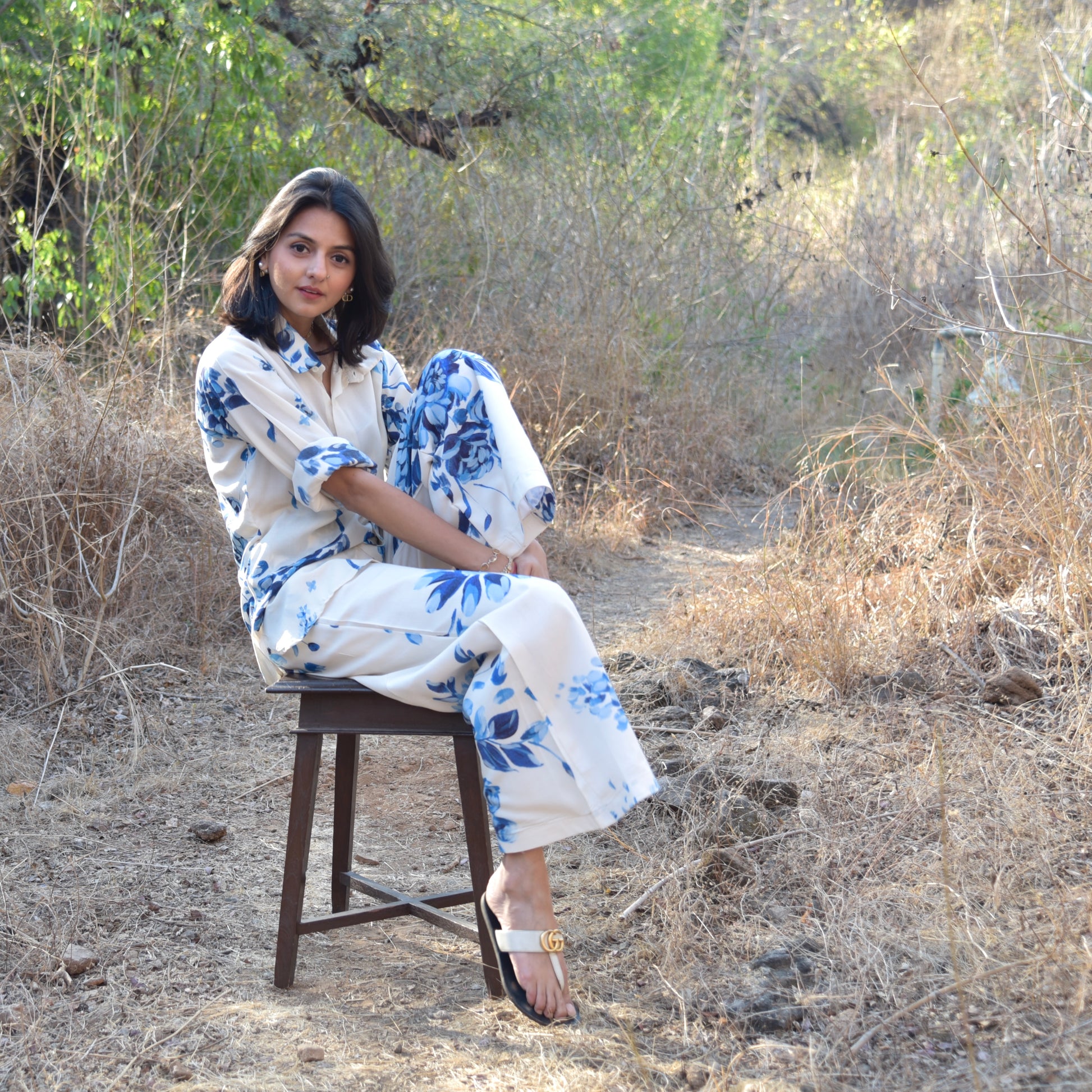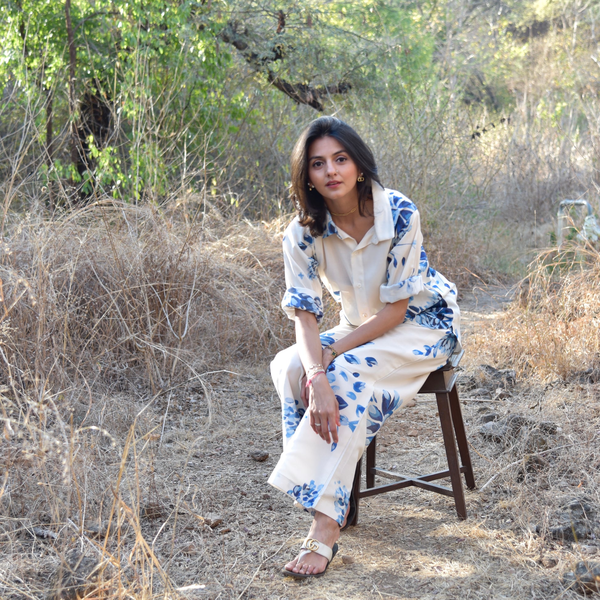 Discover the Daisy Set in White, a stunning co-ord set adorned with floral motifs. The shirt is a full sleeves long with rounded edges with delicate mother of pearl buttons. Paired with high-waisted, straight-leg pants, this set offers a timeless silhouette that exudes sophistication. Embrace the beauty of nature and radiate effortless style with this enchanting co-ord set, perfect for any occasion where you want to make a statement with sophistication.