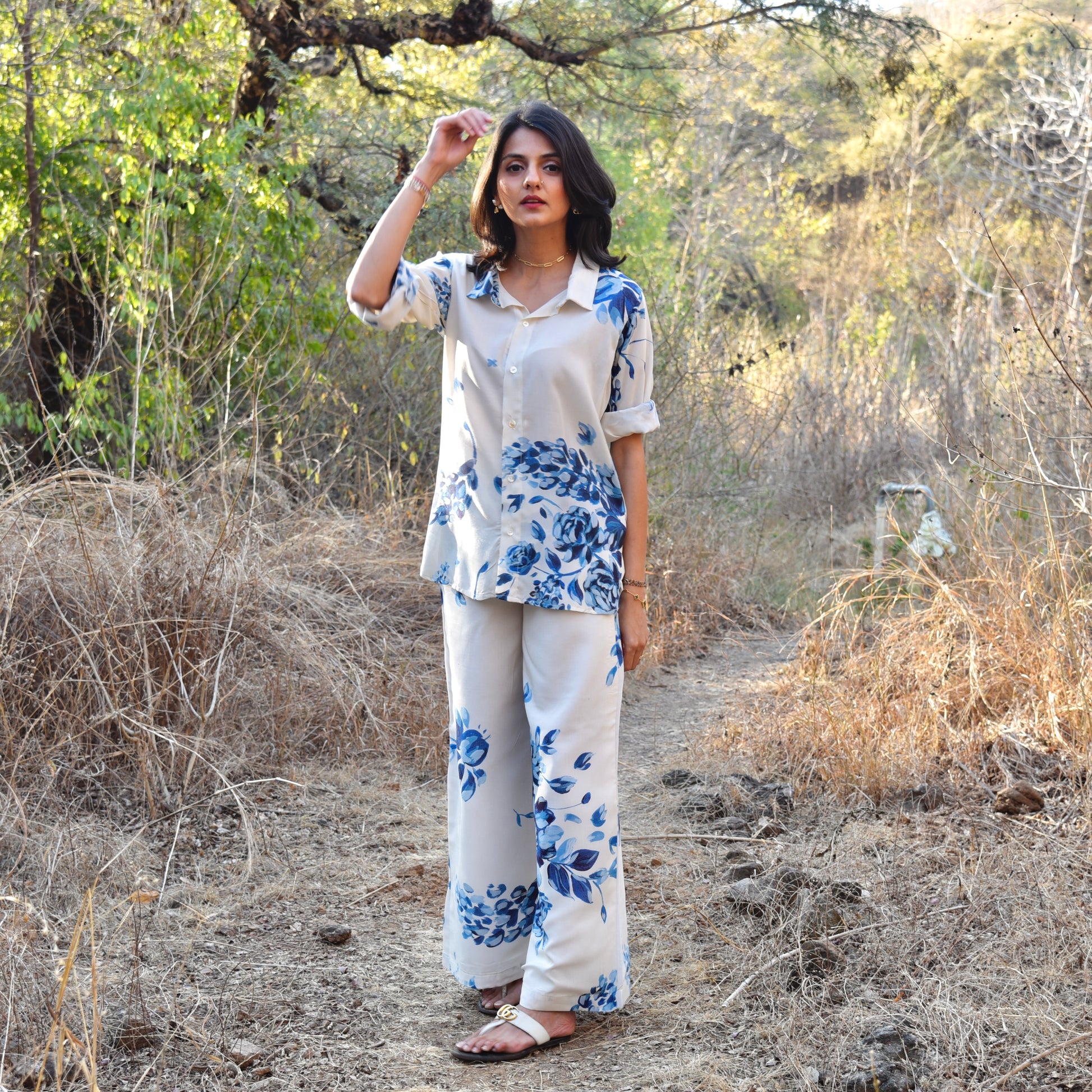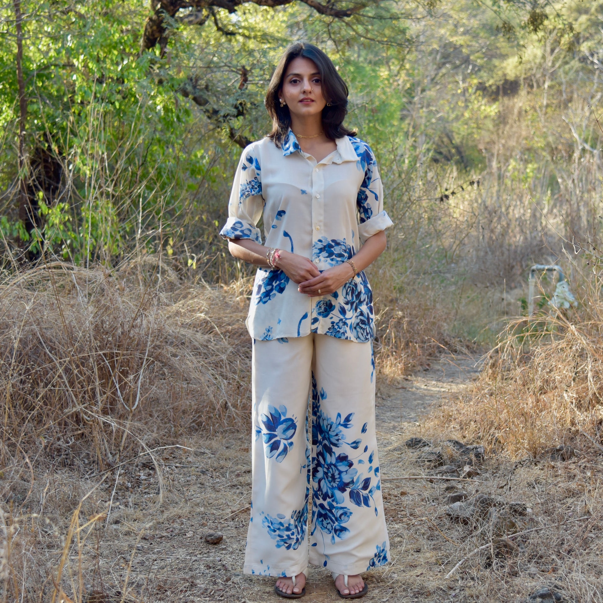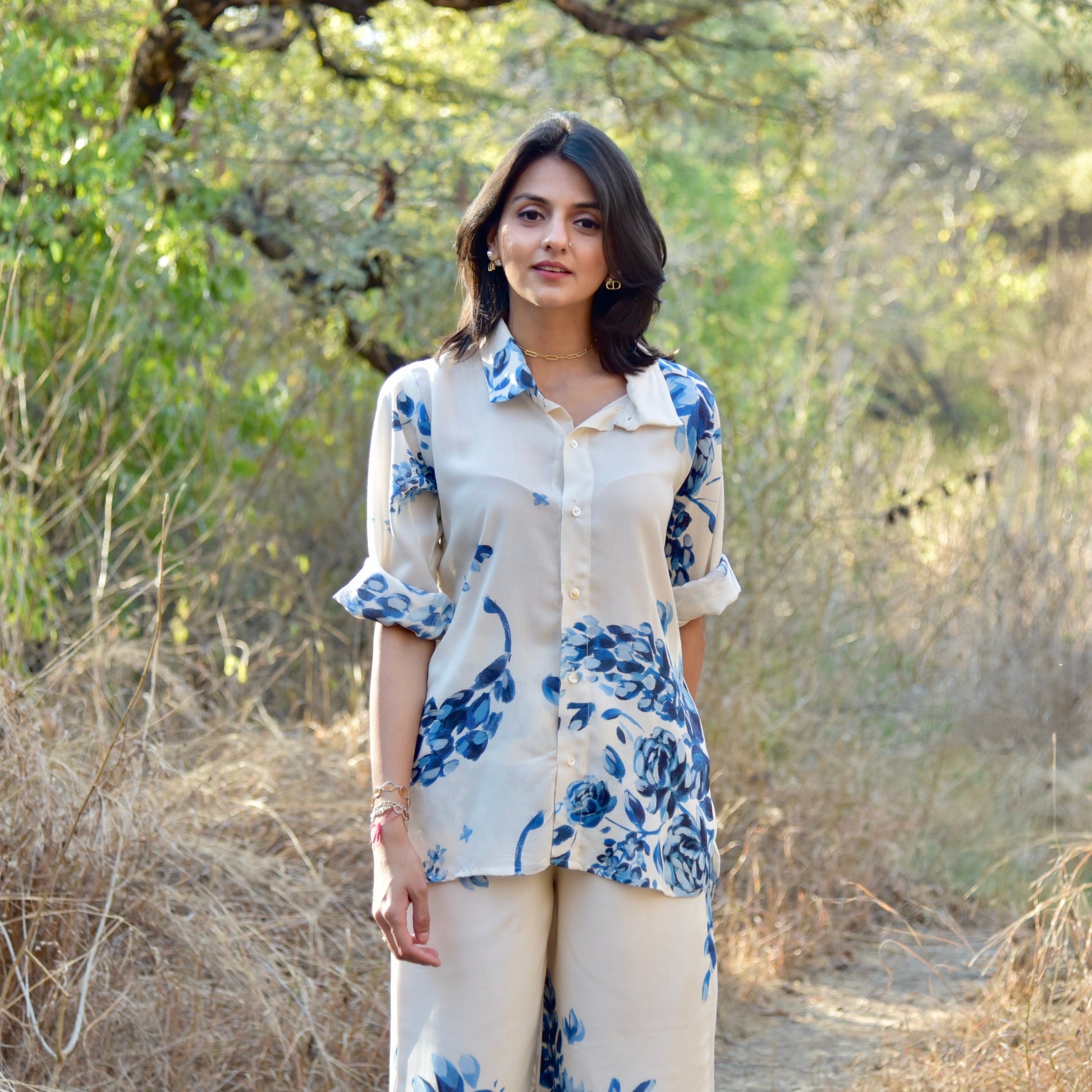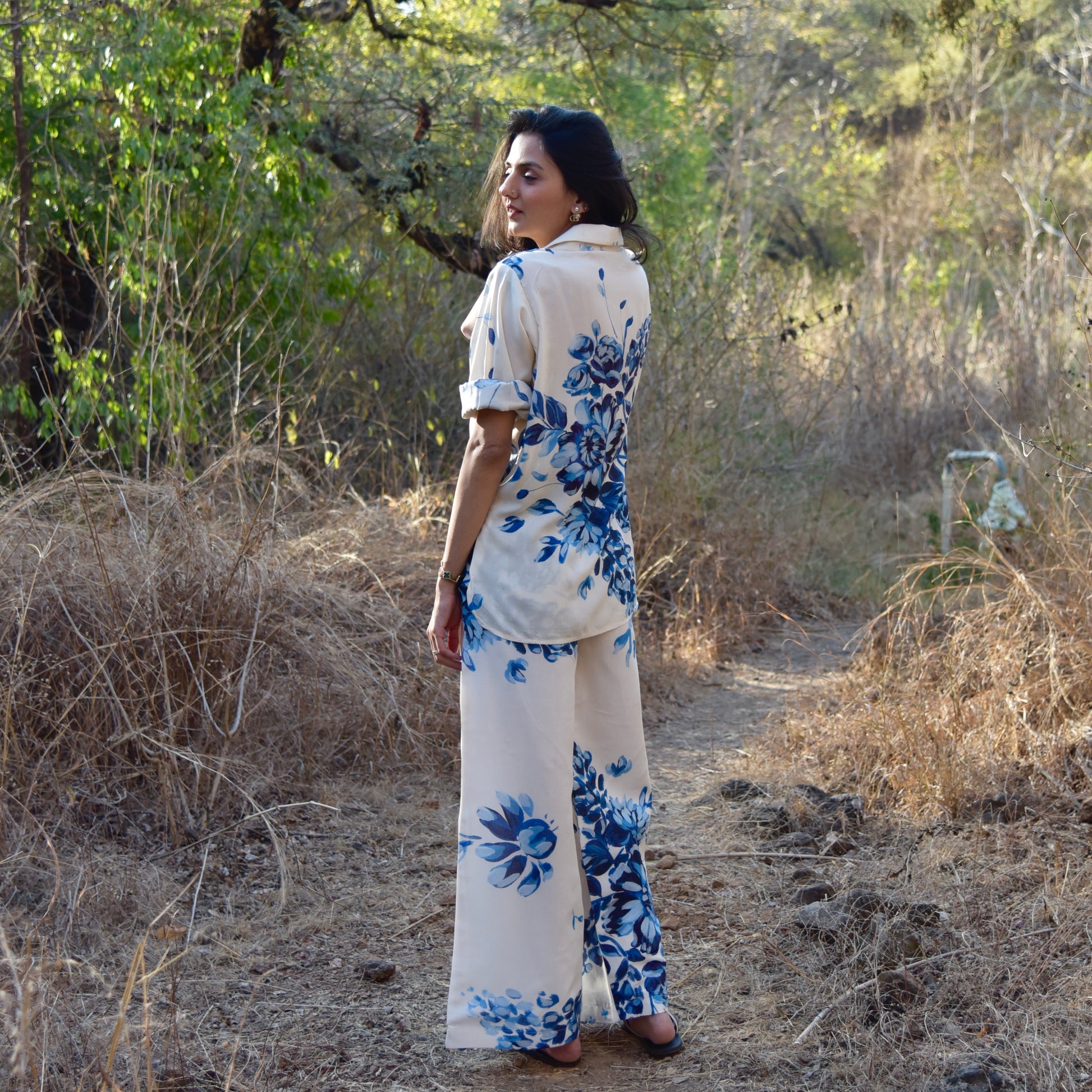 Discover the Daisy Set in White, a stunning co-ord set adorned with floral motifs. The shirt is a full sleeves long with rounded edges with delicate mother of pearl buttons. Paired with high-waisted, straight-leg pants, this set offers a timeless silhouette that exudes sophistication. Embrace the beauty of nature and radiate effortless style with this enchanting co-ord set, perfect for any occasion where you want to make a statement with sophistication.