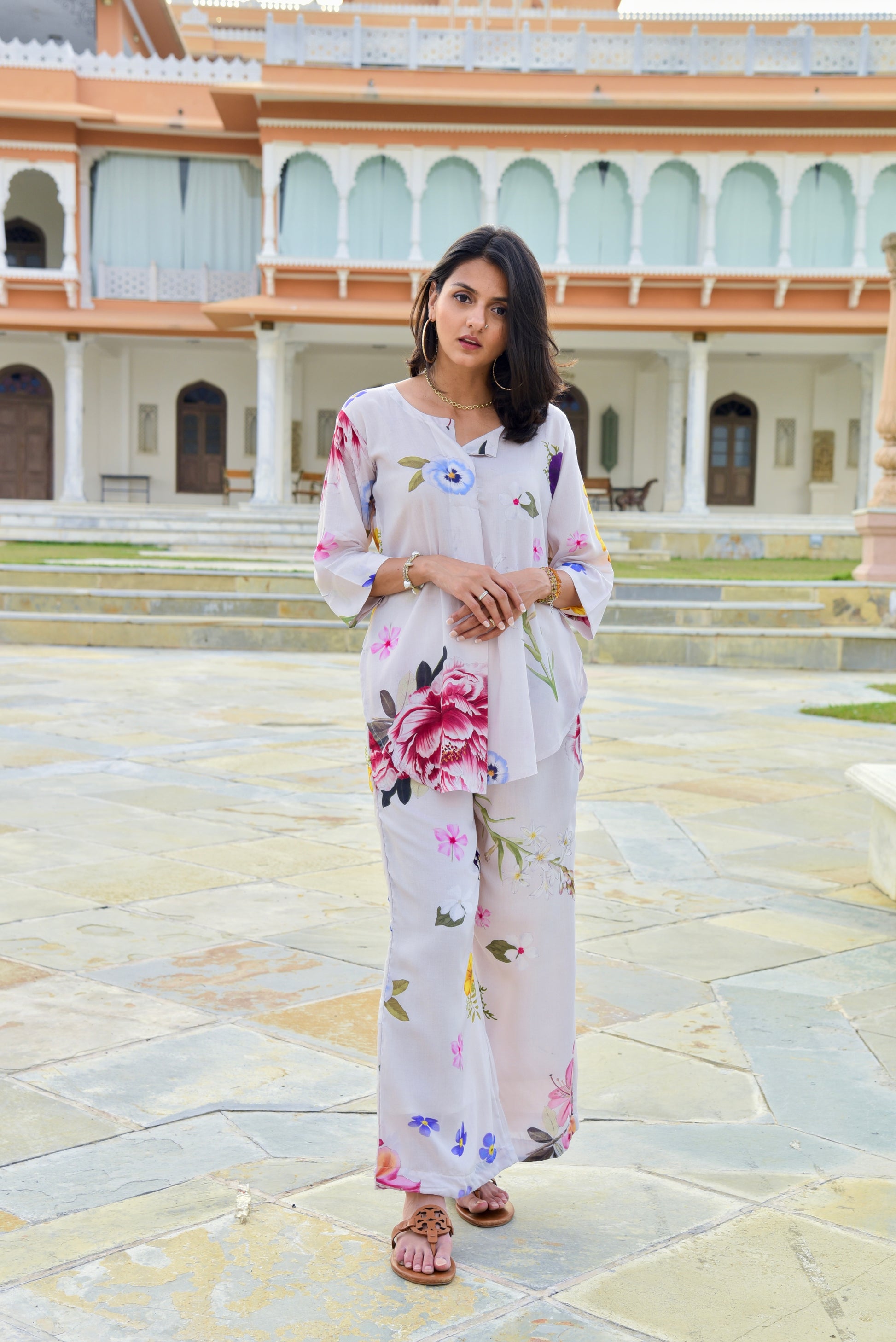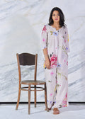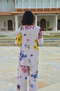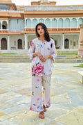 This Cream-Pink Floral Kurta Set is designed with comfort and ease in mind. The short kurta features a round neckline with a front slit, 3/4th sleeves, and a single broad front tuck that adds structure while keeping the silhouette relaxed. Paired with straight-fit pants in the same floral print, the set is light, breathable, and perfect for everyday wear.