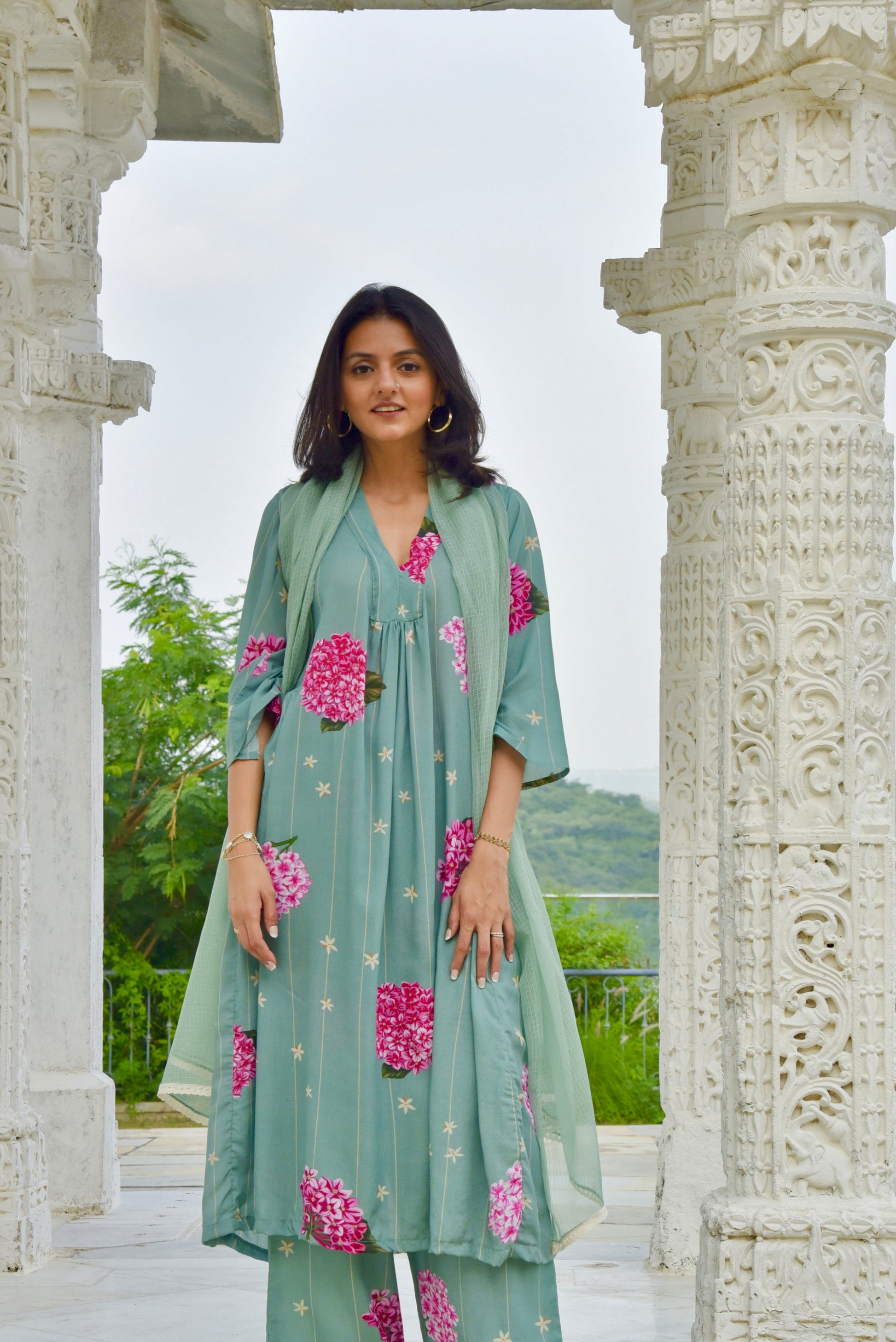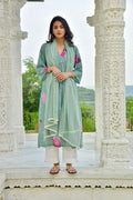 A graceful kurta and dupatta set is designed with flow and movement in mind. The kurta features soft ruffles along the front and kalis on the sides, creating an easy, flattering silhouette. Completing the look is a matching green dyed Kota doriya dupatta, finished with delicate cream lace on both ends — a light, airy layer that ties the ensemble together beautifully.