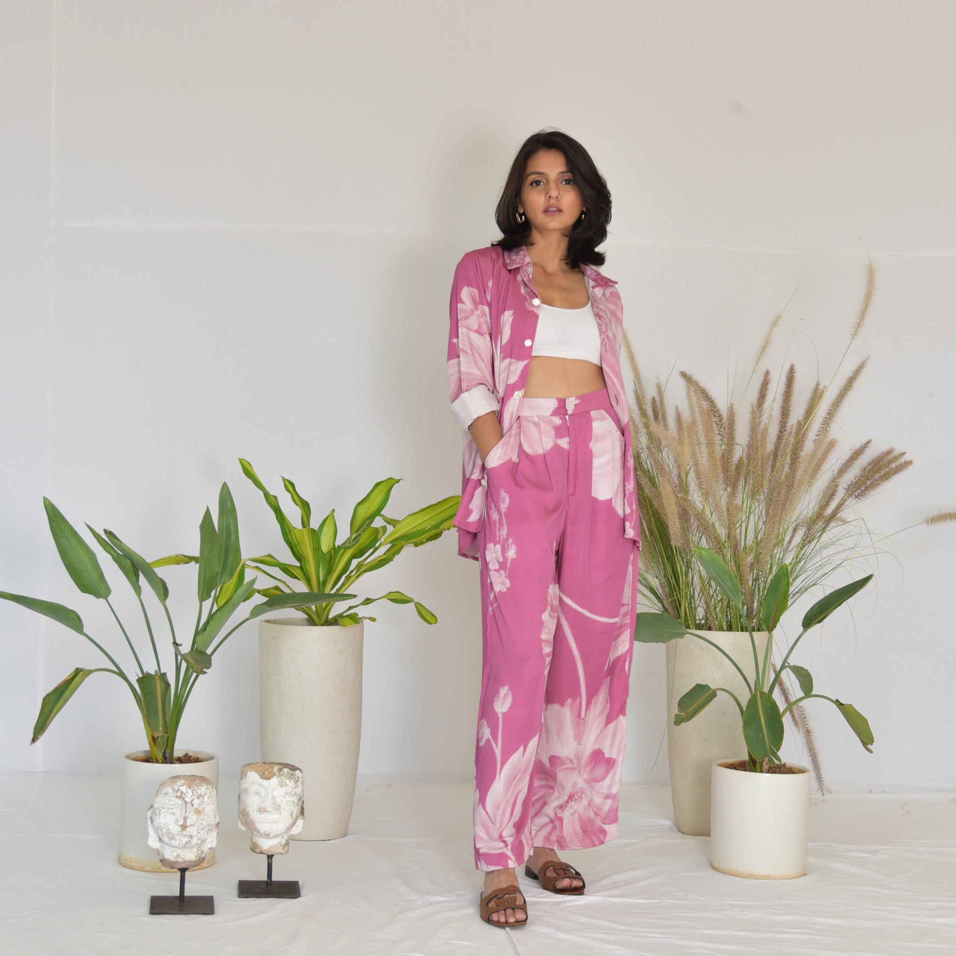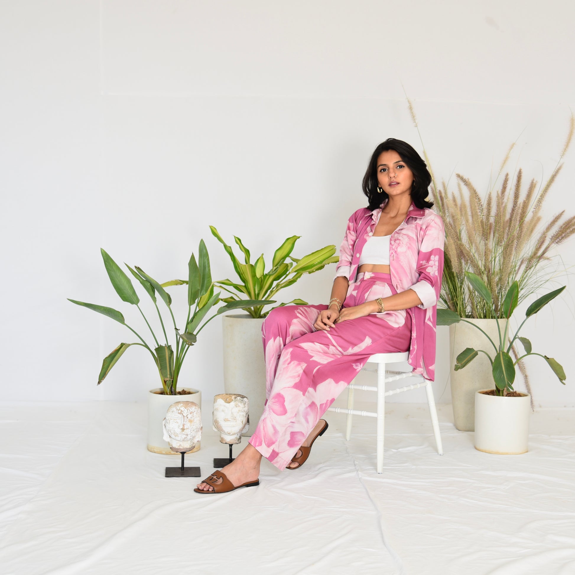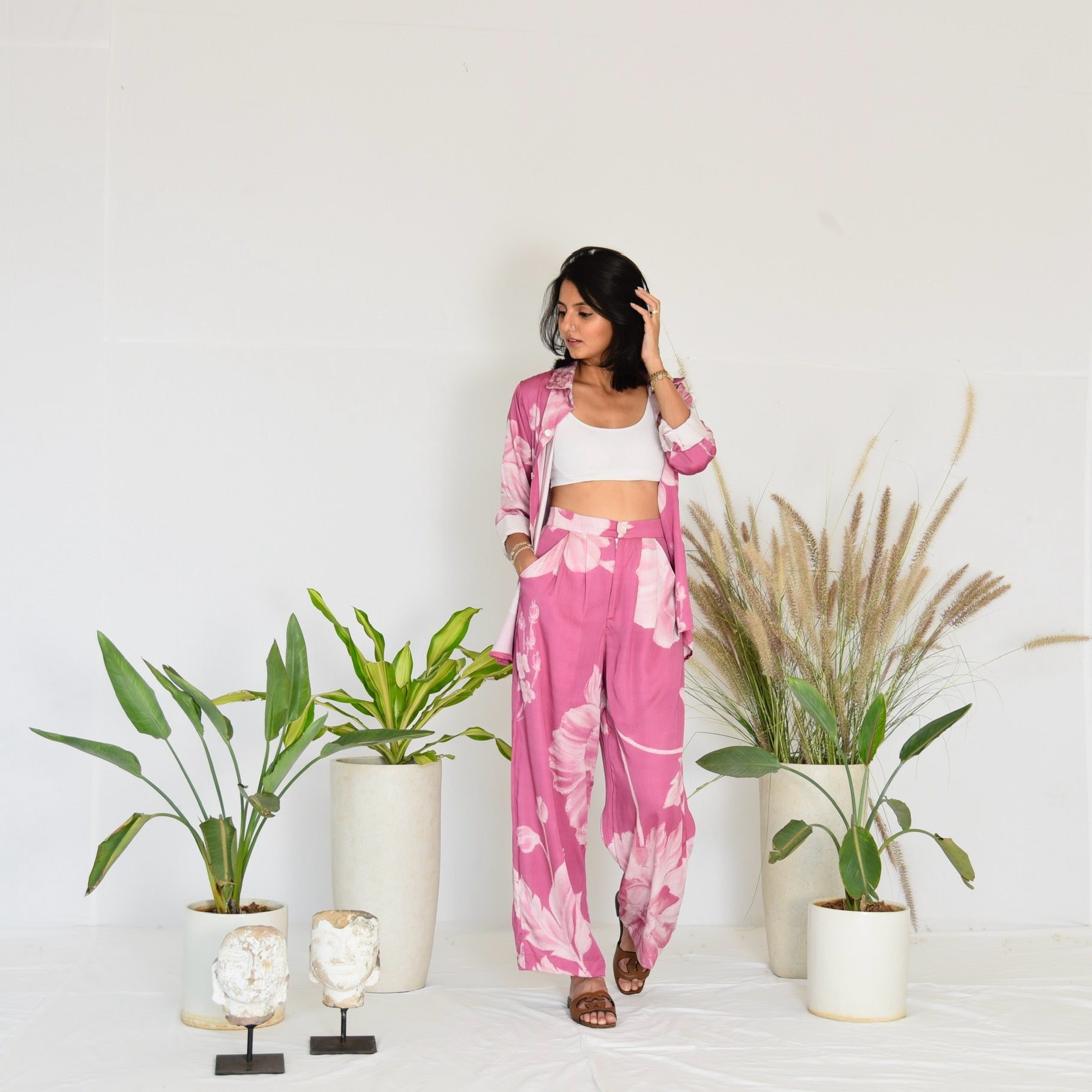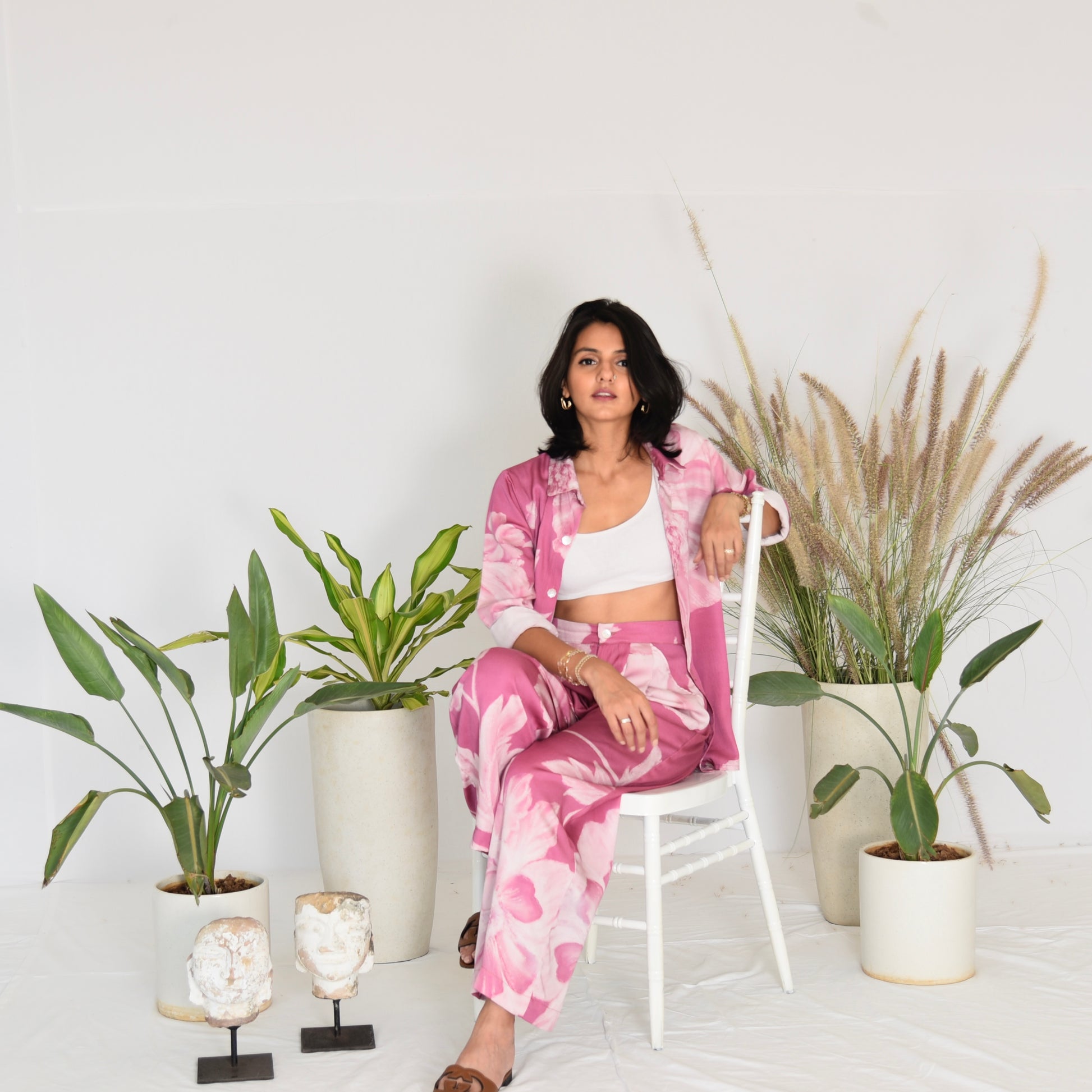 Presenting our pink floral printed co-ord set. The shirt has full sleeves and long aggregated cuffs to add a bit drama to the outfit . Delicate mother of pearl flowers buttons elevate the outfit with a subtle hint of charm. Paired with high-waisted, straight-leg pants, this set offers a timeless silhouette that exudes sophistication.