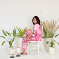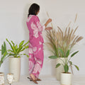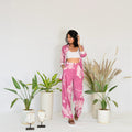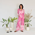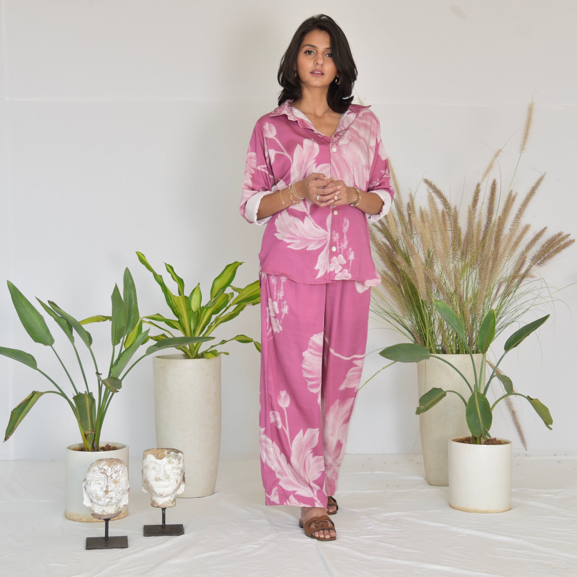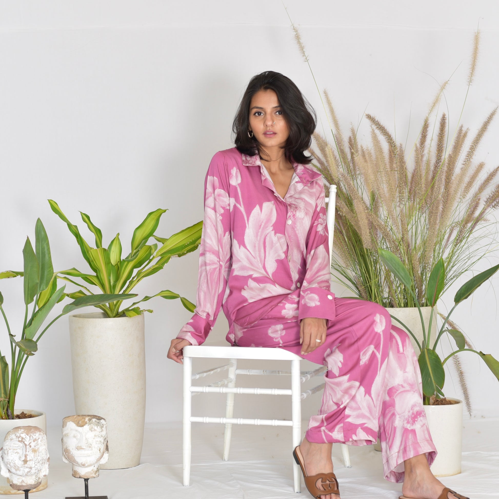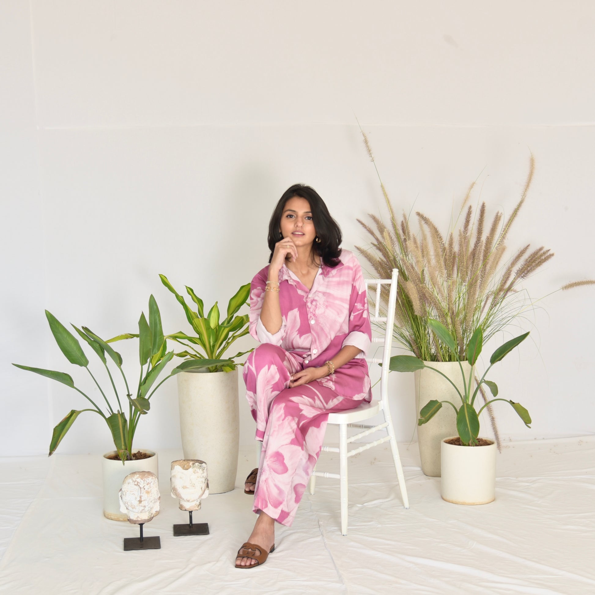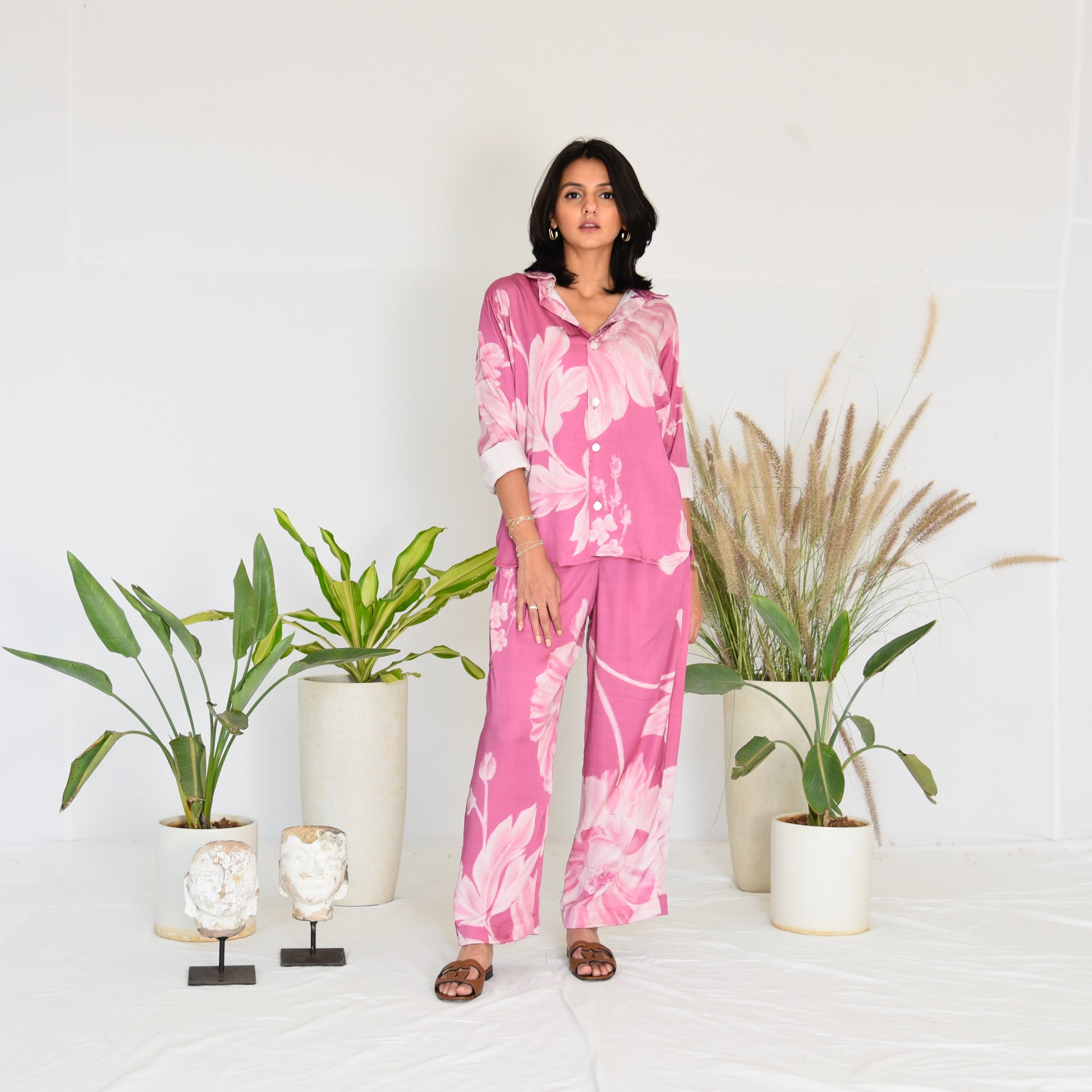 Presenting our pink floral printed co-ord set. The shirt has full sleeves and long aggregated cuffs to add a bit drama to the outfit . Delicate mother of pearl flowers buttons elevate the outfit with a subtle hint of charm. Paired with high-waisted, straight-leg pants, this set offers a timeless silhouette that exudes sophistication.