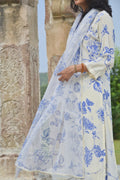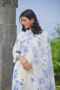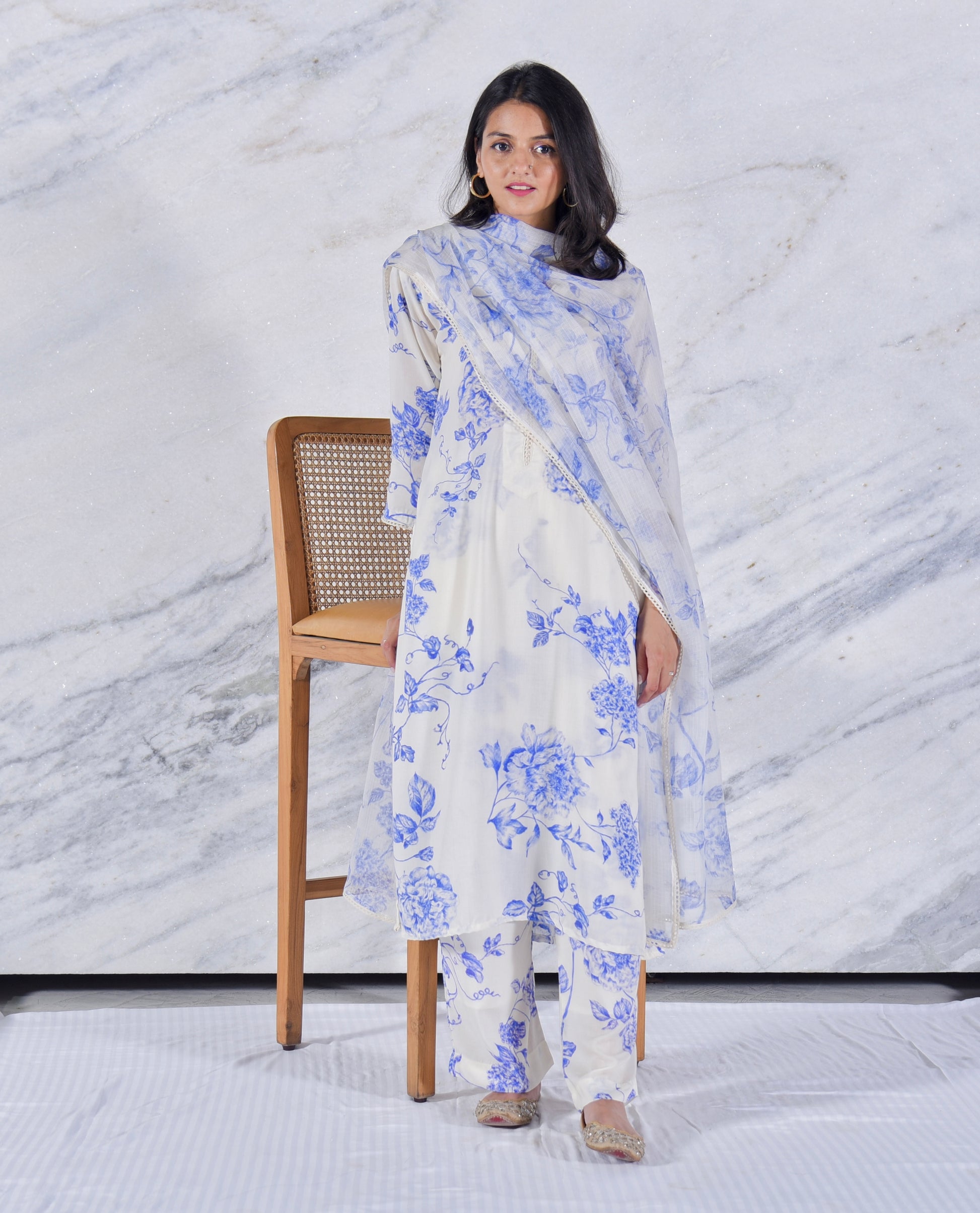 Fresh, elegant, and effortlessly timeless — this Ivory & Blue Floral Kurta Set is crafted for easy everyday grace. The V-neck kurta features delicate lace detailing on the neckline and sleeve hems, adding a refined feminine touch. Paired with matching pants and a coordinated dupatta finished with lace trim all around, this set blends classic prints with modern finesse.