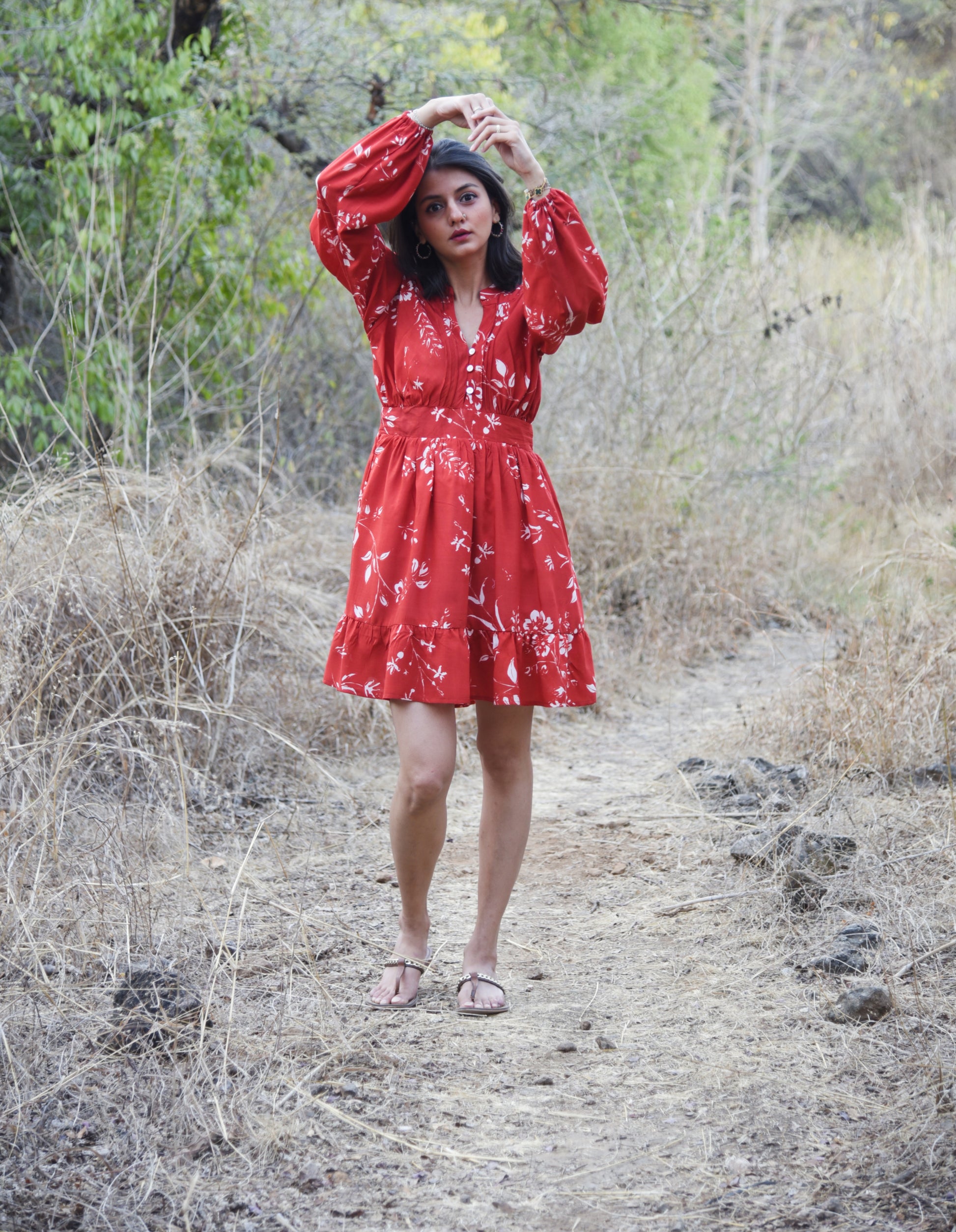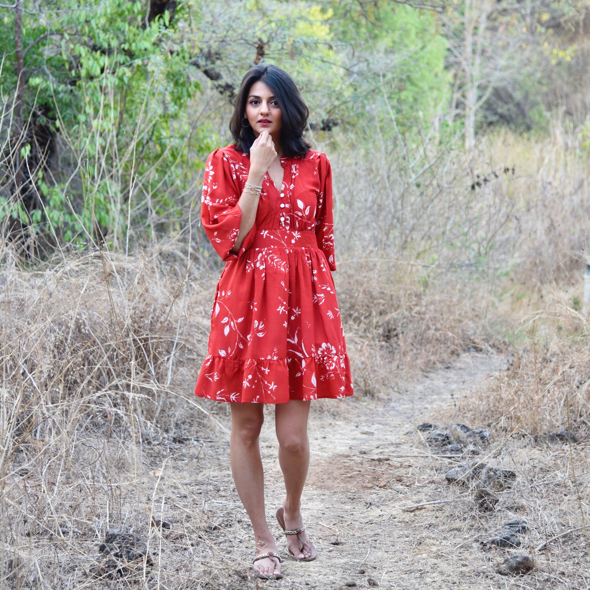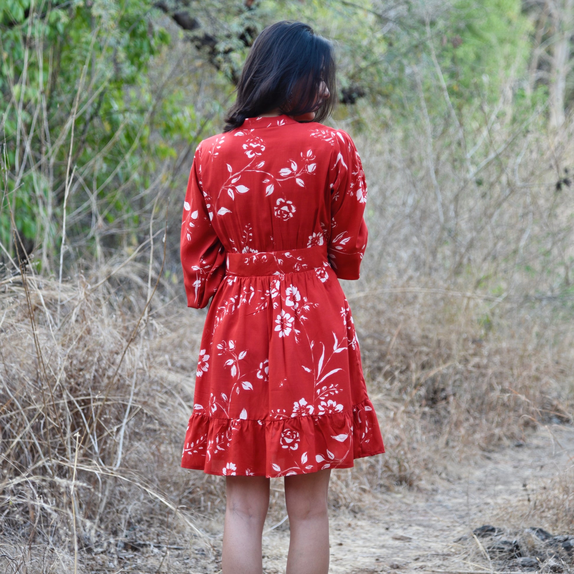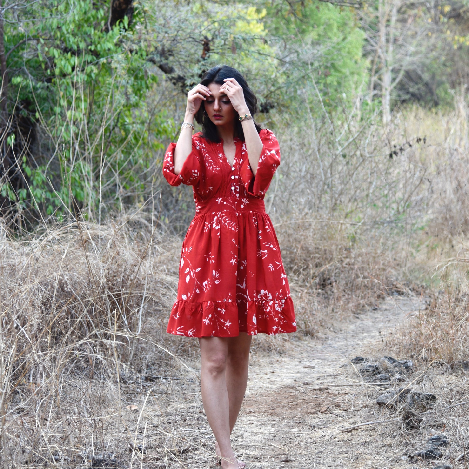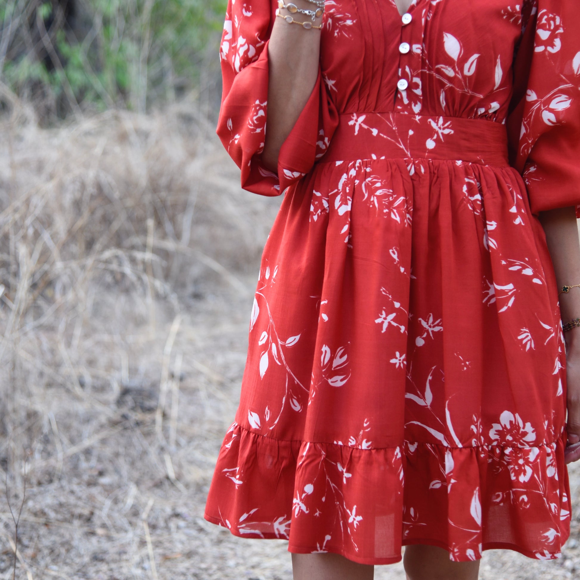 Presenting our red floral dress. This fit and flare dress features two tiers, adding a touch of romance to the design. The dress have chinese collar and pin tuck details on the bust and mother of pearl buttons till the waist, enhancing its feminine charm. Completing the look, the 3/4 sleeves feature puffed elastic detailing, adding a playful yet sophisticated element to the ensemble.