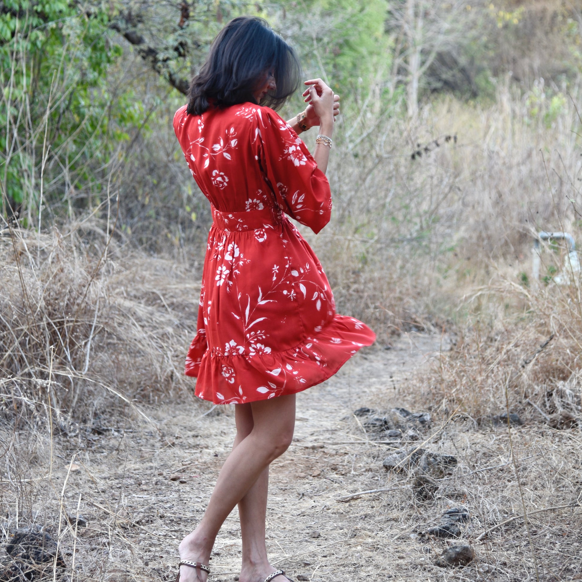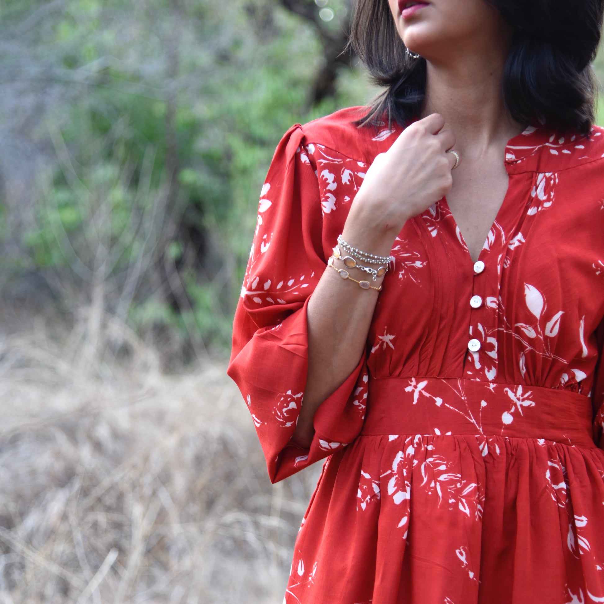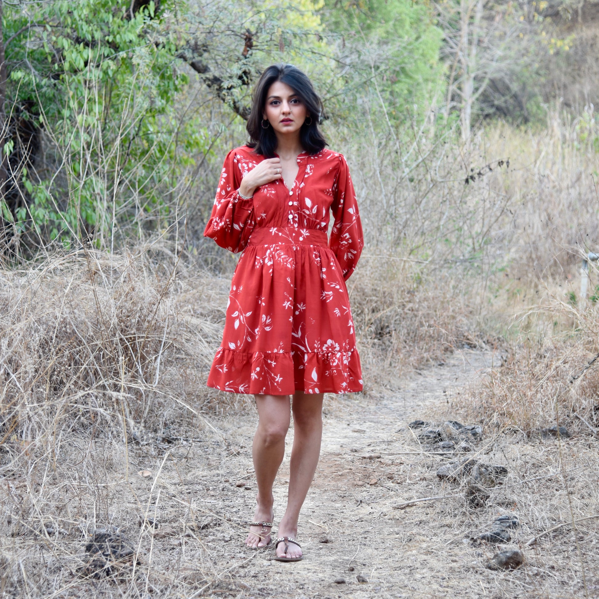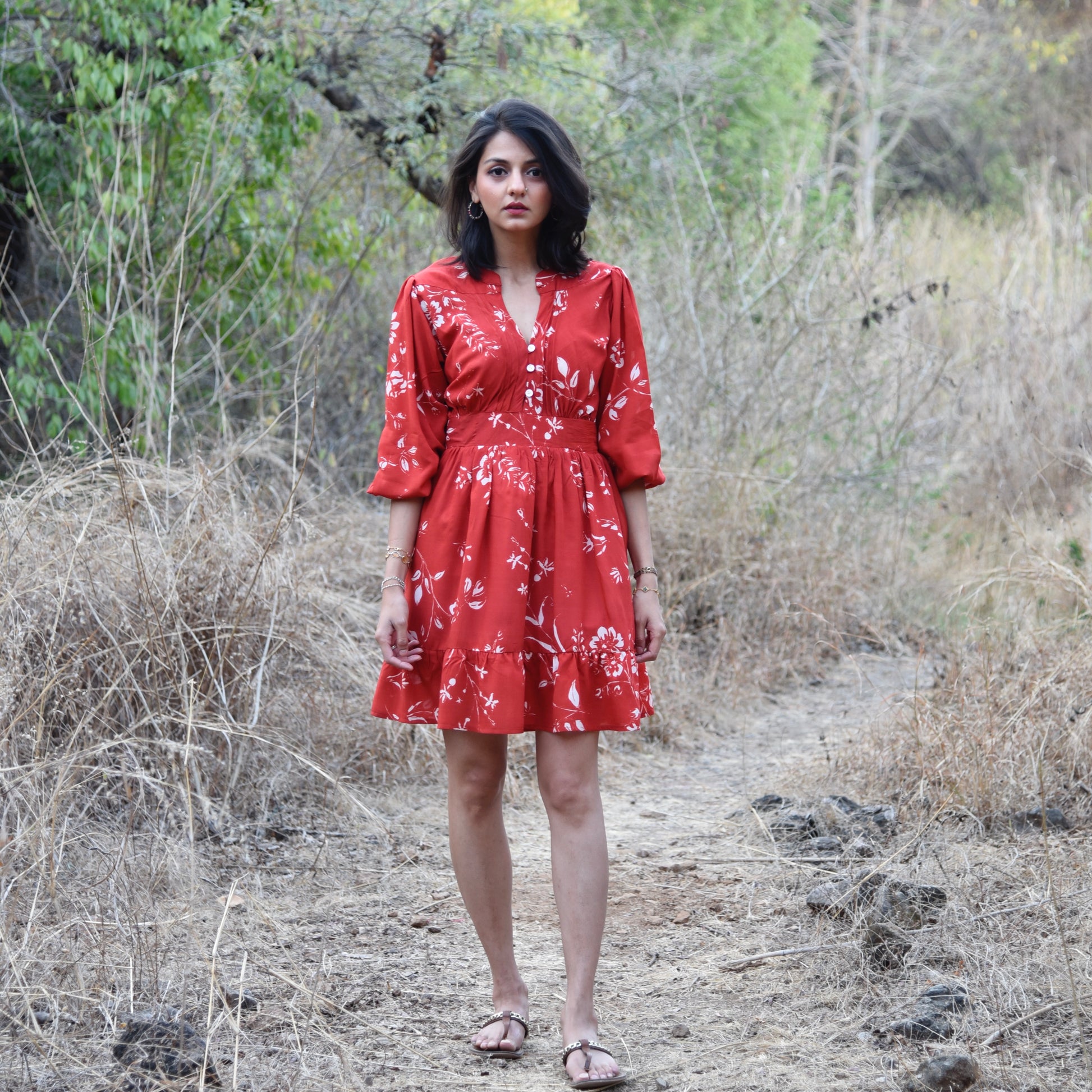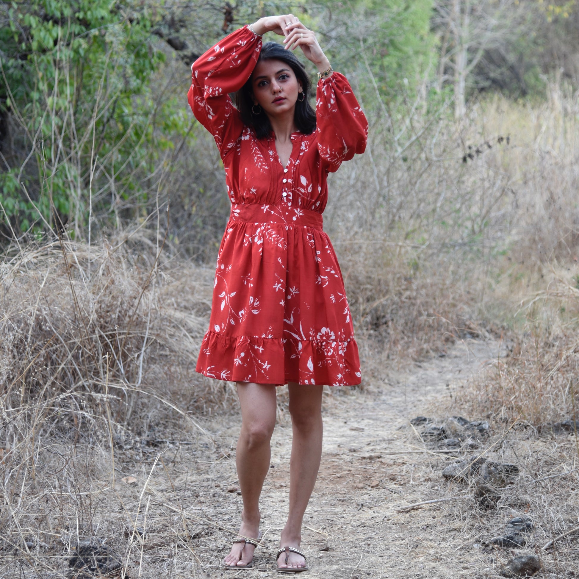 Presenting our red floral dress. This fit and flare dress features two tiers, adding a touch of romance to the design. The dress have chinese collar and pin tuck details on the bust and mother of pearl buttons till the waist, enhancing its feminine charm. Completing the look, the 3/4 sleeves feature puffed elastic detailing, adding a playful yet sophisticated element to the ensemble.