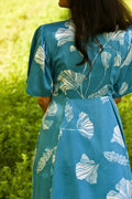 Introducing the Siria Dress, a stunning blue printed dress featuring a fitted silhouette till the chest, accentuating your curves with grace and style. Adorned with Kalis, it gracefully cascades down, creating a beautiful flare and adding movement to the dress. The sleeves boast flared details, adding a touch of femininity and sophistication. Not forgetting practicality, this dress comes with pockets, providing both convenience and functionality. Crafted from luxurious modal satin fabric, the Siria Dress is perfect for any occasion, blending elegance and comfort effortlessly.
