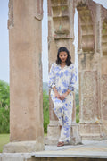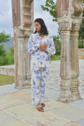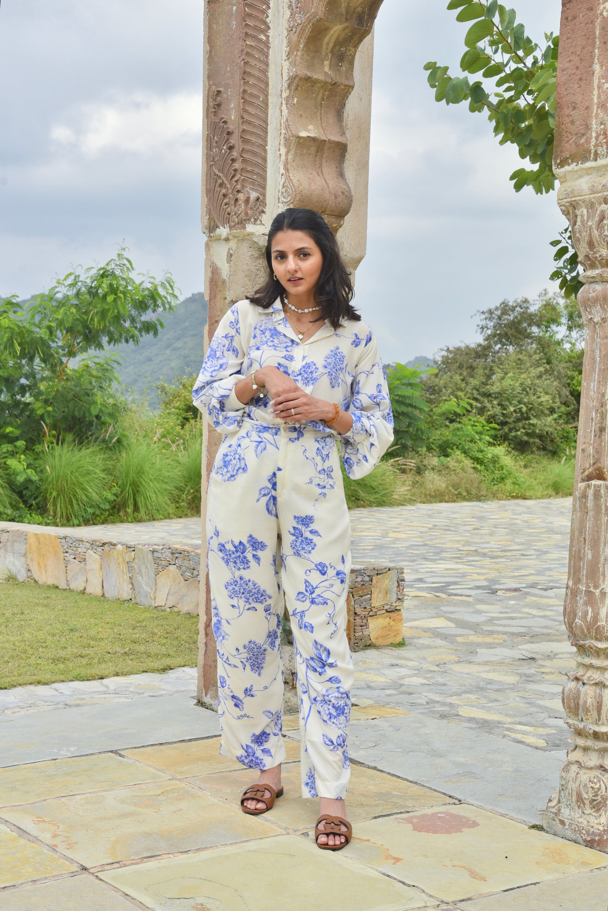 Step into effortless style with this chic Ivory & Blue Floral Co-ord Set. The shirt is crafted in a relaxed button-down silhouette with a soft collar and slightly puffed sleeves that taper gently at the cuff, giving it a touch of volume and ease. Paired with straight-fit pants in a matching floral print, designed with a front zip closure and finished with a delicate mother-of-pearl flower button — a detail that adds quiet charm. Lightweight and breezy, this set is an effortless choice for days that call for understated sophistication.